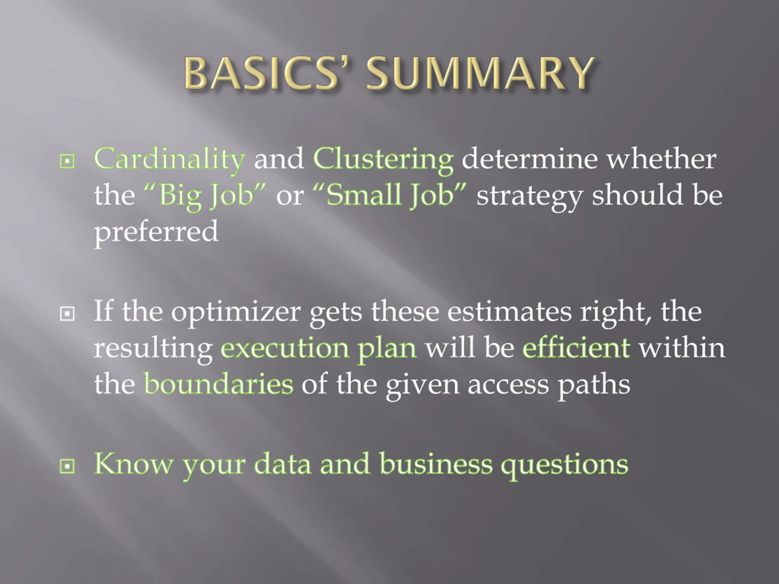 Cardinality and Clustering determine whether the Big Job or Small Job strategy should be preferred If the optimizer gets these estimates right, the resulting execution plan will be efficient within the boundaries of the given access paths Know your data and business questions