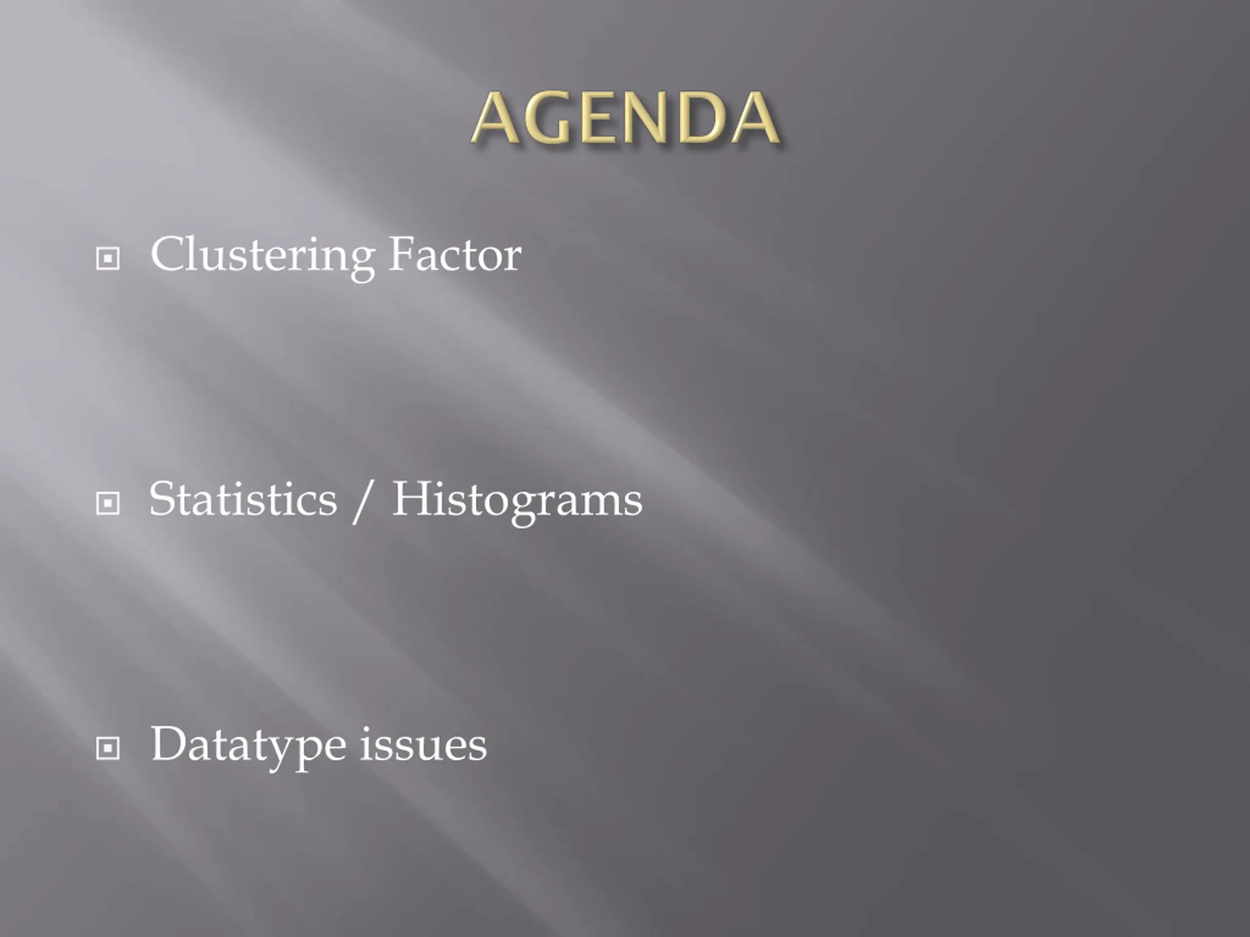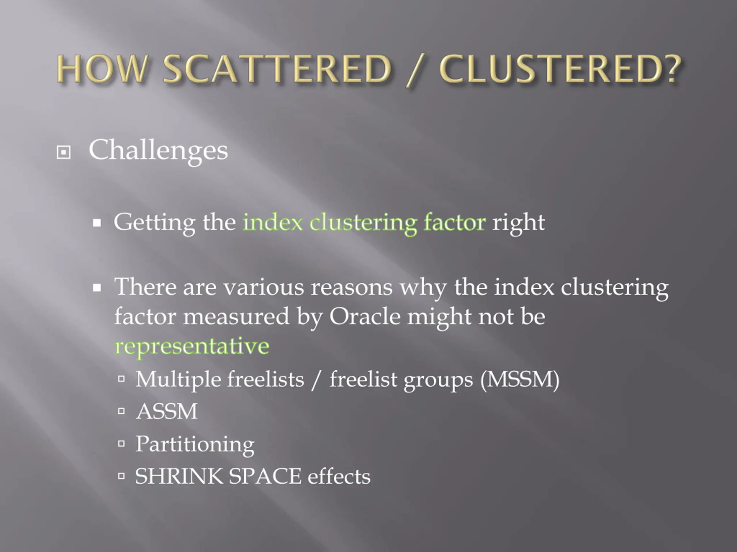 Challenges Getting the index clustering factor right There are various reasons why the index clustering factor measured by Oracle might not be representative Multiple freelists / freelist groups (MSSM) ASSM Partitioning SHRINK SPACE effects