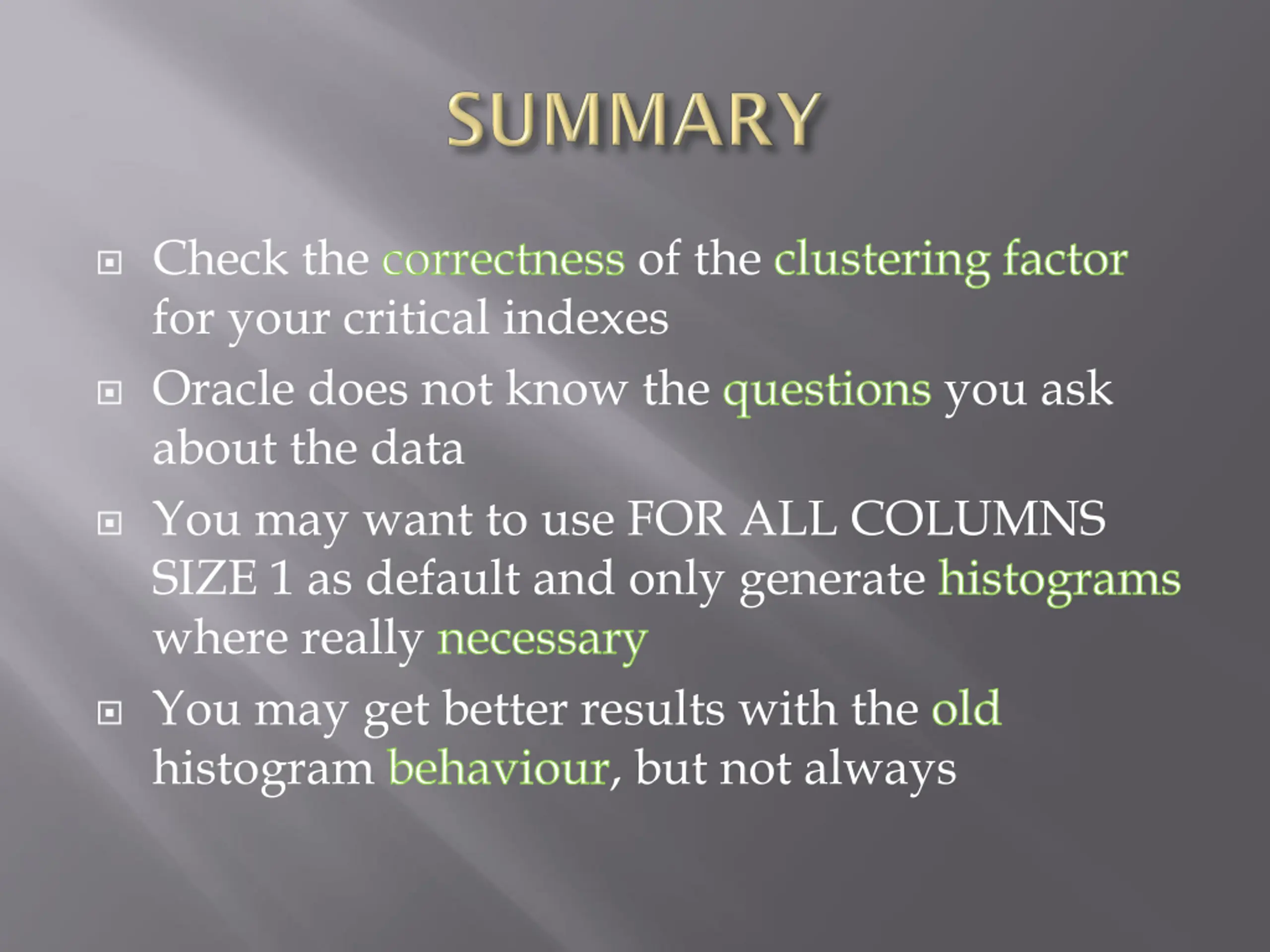 There are data patterns that dont work well with histograms when generated via Oracle => You may need to manually generate histograms using DBMS_STATS.SET_COLUMN_STATS for critical columns Don t forget about Dynamic Sampling / Function Based Indexes / Virtual Columns / Extended Statistics Know your data and business questions!