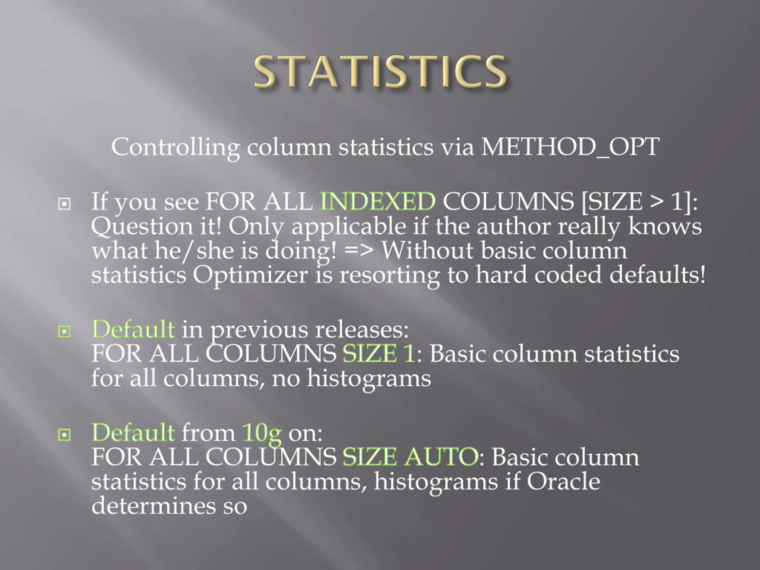 Controlling column statistics via METHOD_OPT If you see FOR ALL INDEXED COLUMNS [SIZE > 1]: Question it! Only applicable if the author really knows what he/she is doing! => Without basic column statistics Optimizer is resorting to hard coded defaults! Default in previous releases: FOR ALL COLUMNS SIZE 1: Basic column statistics for all columns, no histograms Default from 10g on: FOR ALL COLUMNS SIZE AUTO: Basic column statistics for all columns, histograms if Oracle determines so