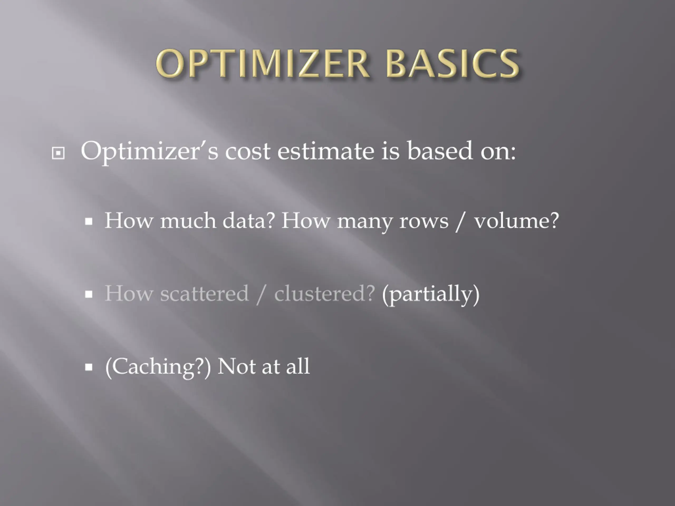 Optimizers cost estimate is based on: How much data? How many rows / volume? (partially) (Caching?) Not at all