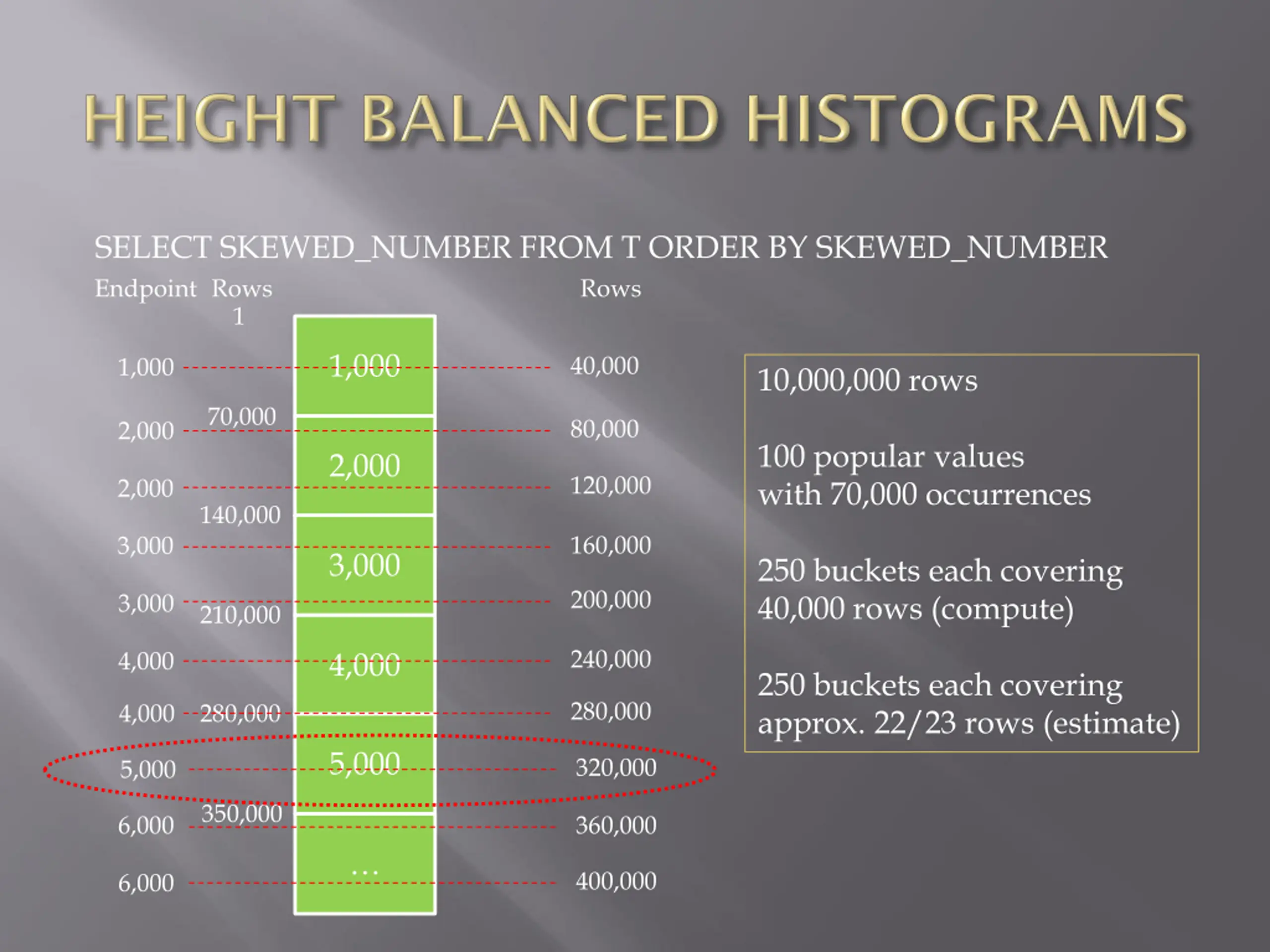 SELECT SKEWED_NUMBER FROM T ORDER BY SKEWED_NUMBER Rows Rows Endpoint 1 1,000 40,000 1,000 10,000,000 rows 70,000 80,000 2,000 100 popular values with 70,000 occurrences 2,000 120,000 2,000 140,000 160,000 3,000 3,000 250 buckets each covering 40,000 rows (compute) 200,000 3,000 210,000 240,000 4,000 4,000 250 buckets each covering approx. 22/23 rows (estimate) 280,000 280,000 4,000 5,000 320,000 5,000 350,000 6,000 360,000 400,000 6,000