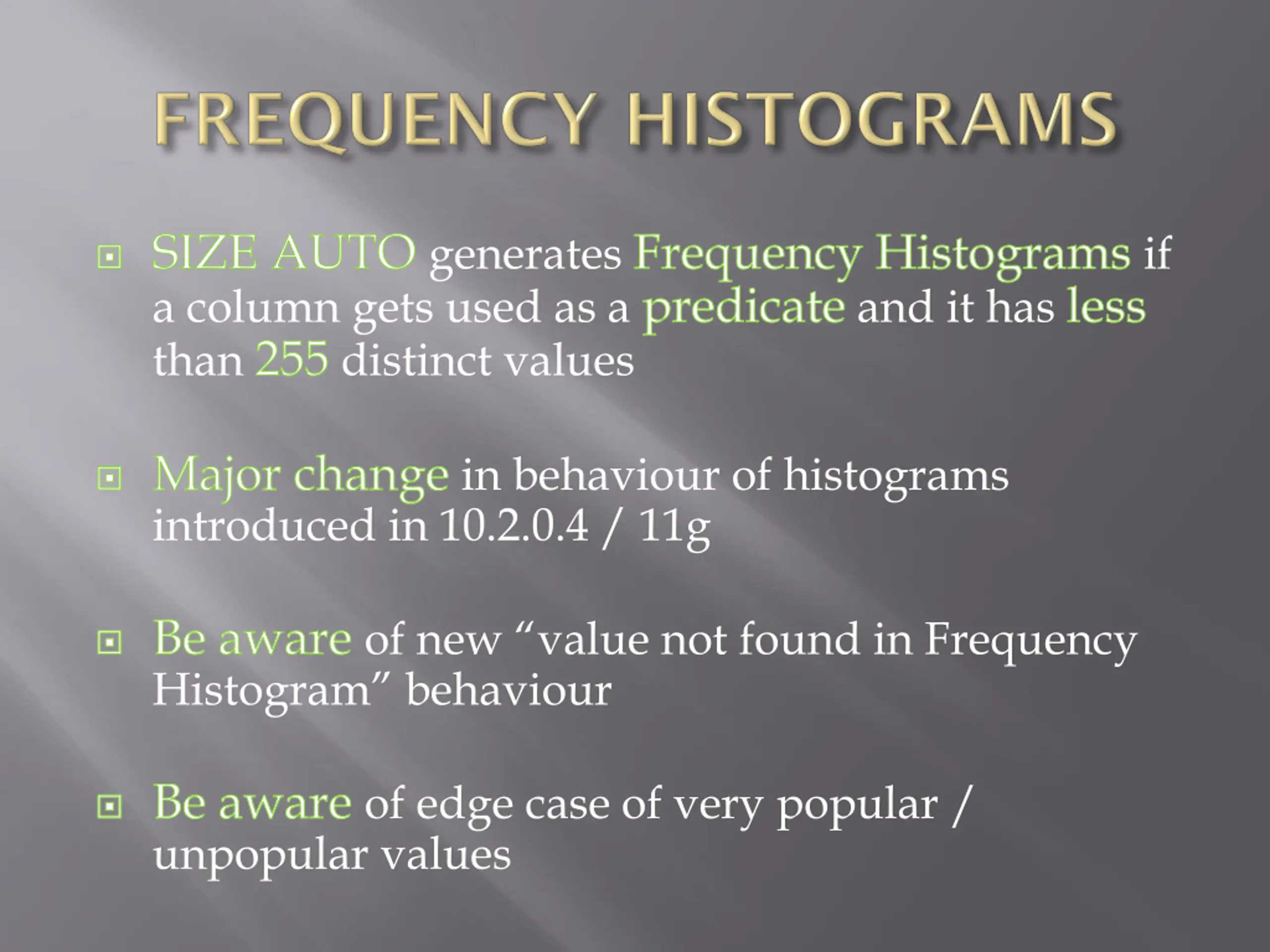 SIZE AUTO generates Frequency Histograms if a column gets used as a predicate and it has less than 255 distinct values Major change in behaviour of histograms introduced in 10.2.0.4 / 11g Be aware of new value not found in Frequency Histogram behaviour Be aware of edge case of very popular / unpopular values