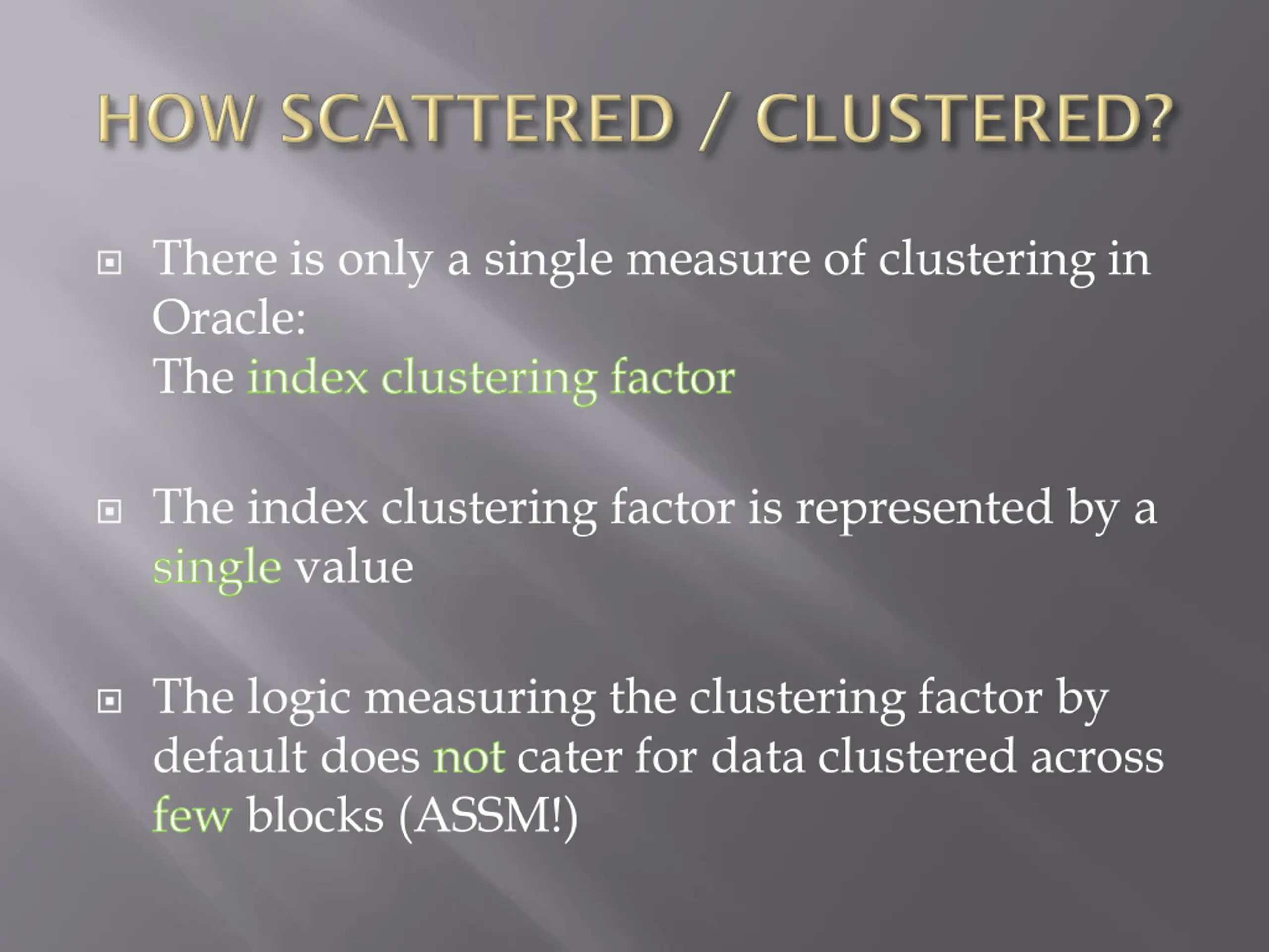There is only a single measure of clustering in Oracle: The index clustering factor The index clustering factor is represented by a single value The logic measuring the clustering factor by default does not cater for data clustered across few blocks (ASSM!)