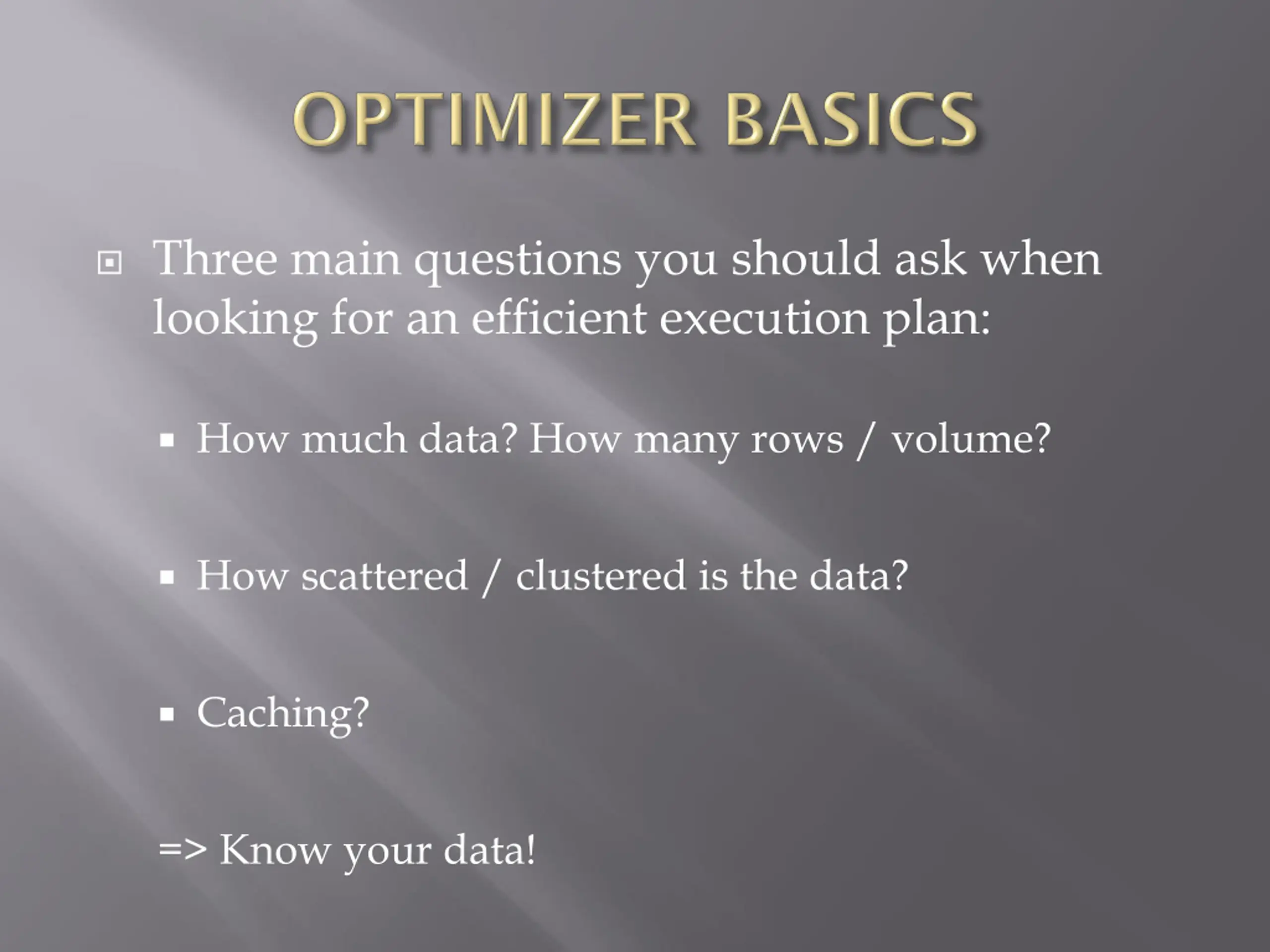 Three main questions you should ask when looking for an efficient execution plan: How much data? How many rows / volume? How scattered / clustered is the data? Caching? => Know your data!