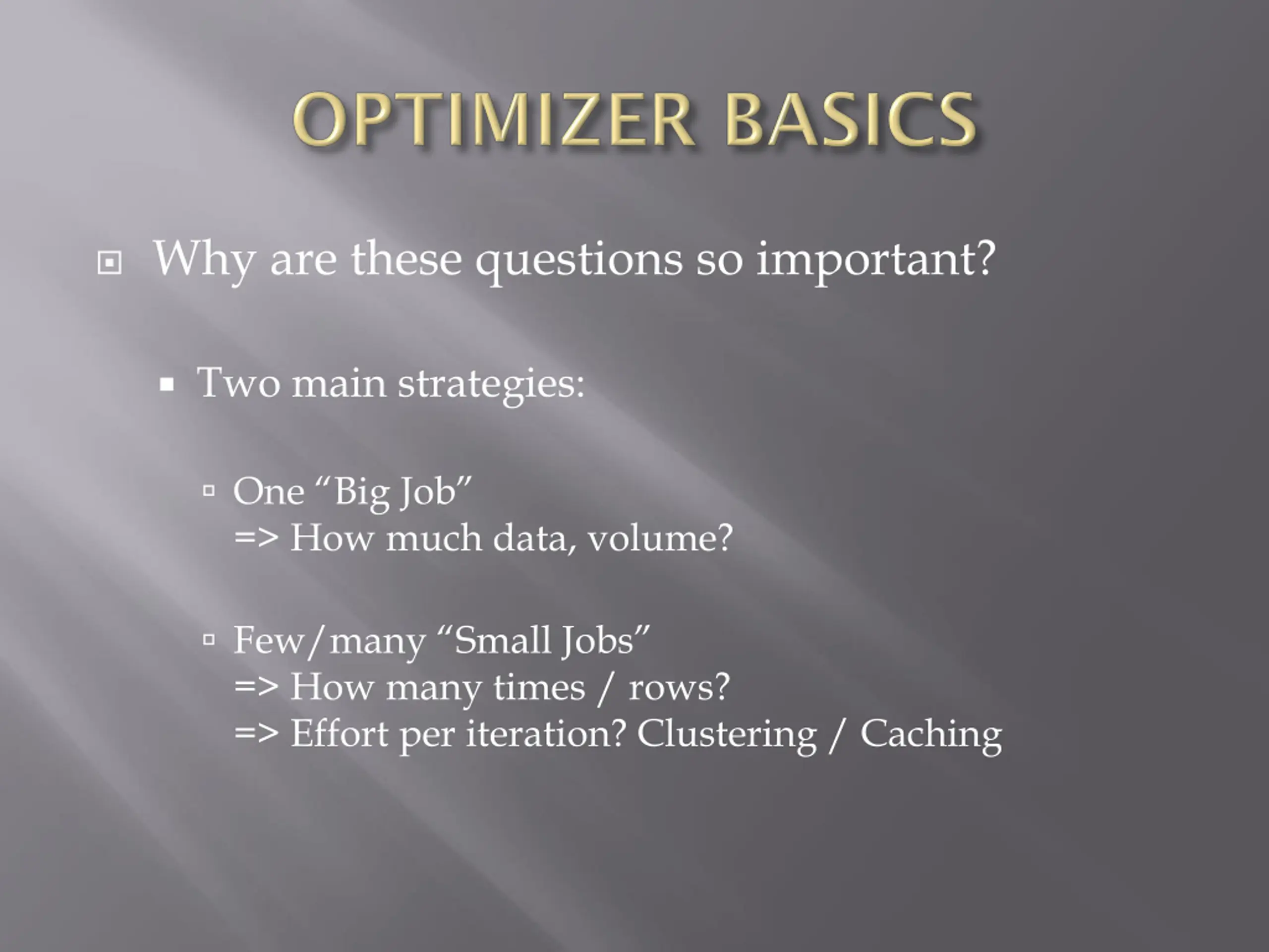 Why are these questions so important? Two main strategies: One Big Job => How much data, volume? Few/many Small Jobs => How many times / rows? => Effort per iteration? Clustering / Caching
