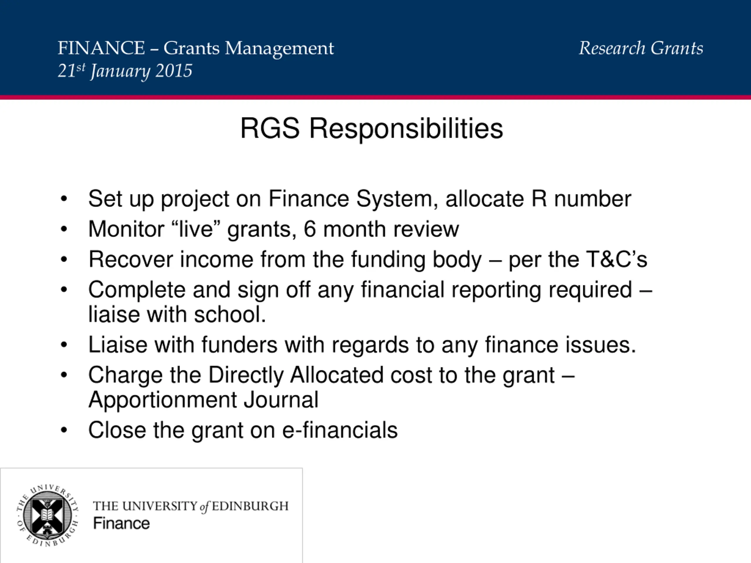 FINANCE Grants Management 21st January 2015 Research Grants RGS Responsibilities Set up project on Finance System, allocate R number Monitor live grants, 6 month review Recover income from the funding body per the T&C s Complete and sign off any financial reporting required liaise with school. Liaise with funders with regards to any finance issues. Charge the Directly Allocated cost to the grant Apportionment Journal Close the grant on e-financials
