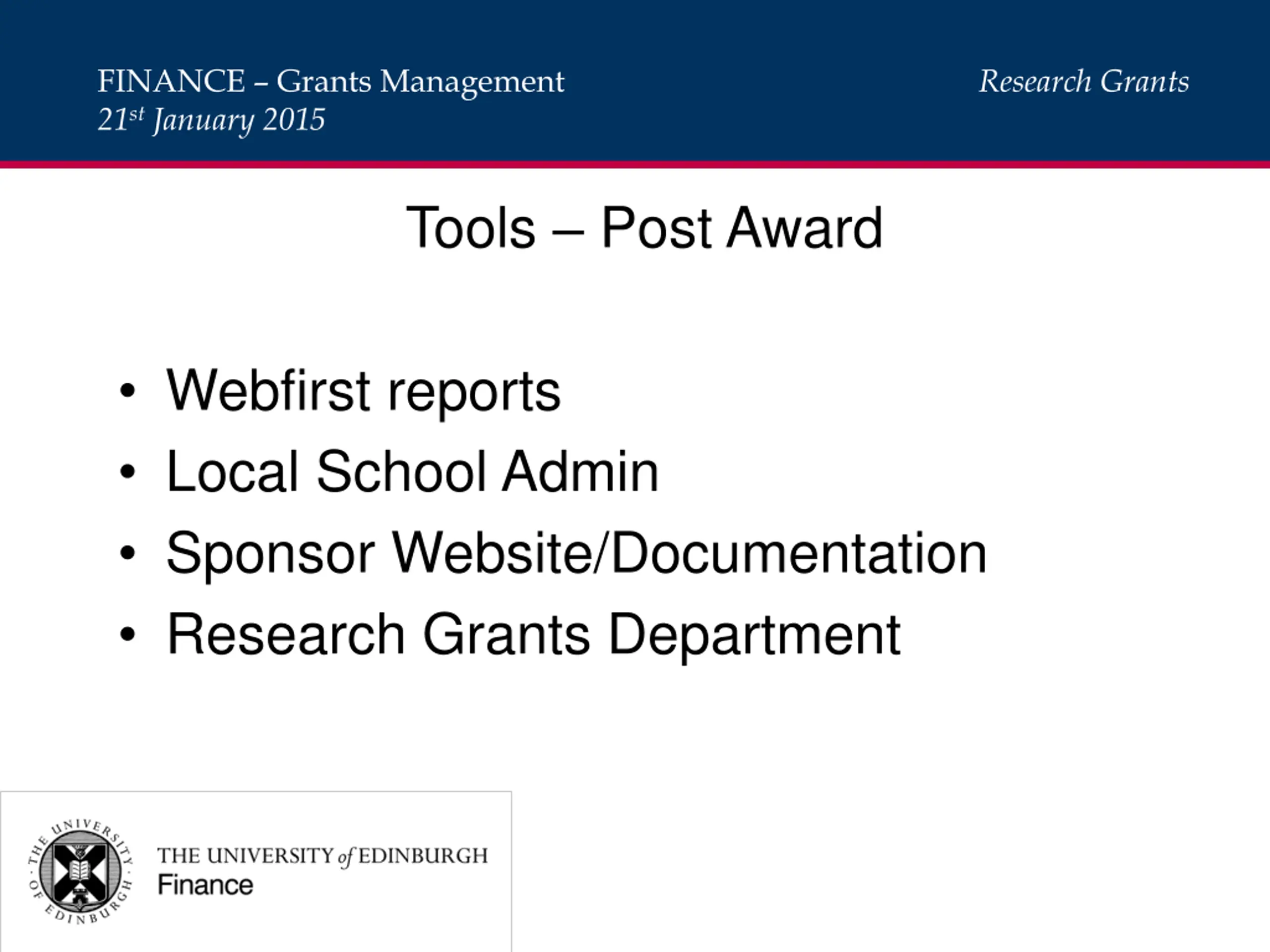 FINANCE Grants Management 21st January 2015 Research Grants Tools Post Award Webfirst reports Local School Admin Sponsor Website/Documentation Research Grants Department