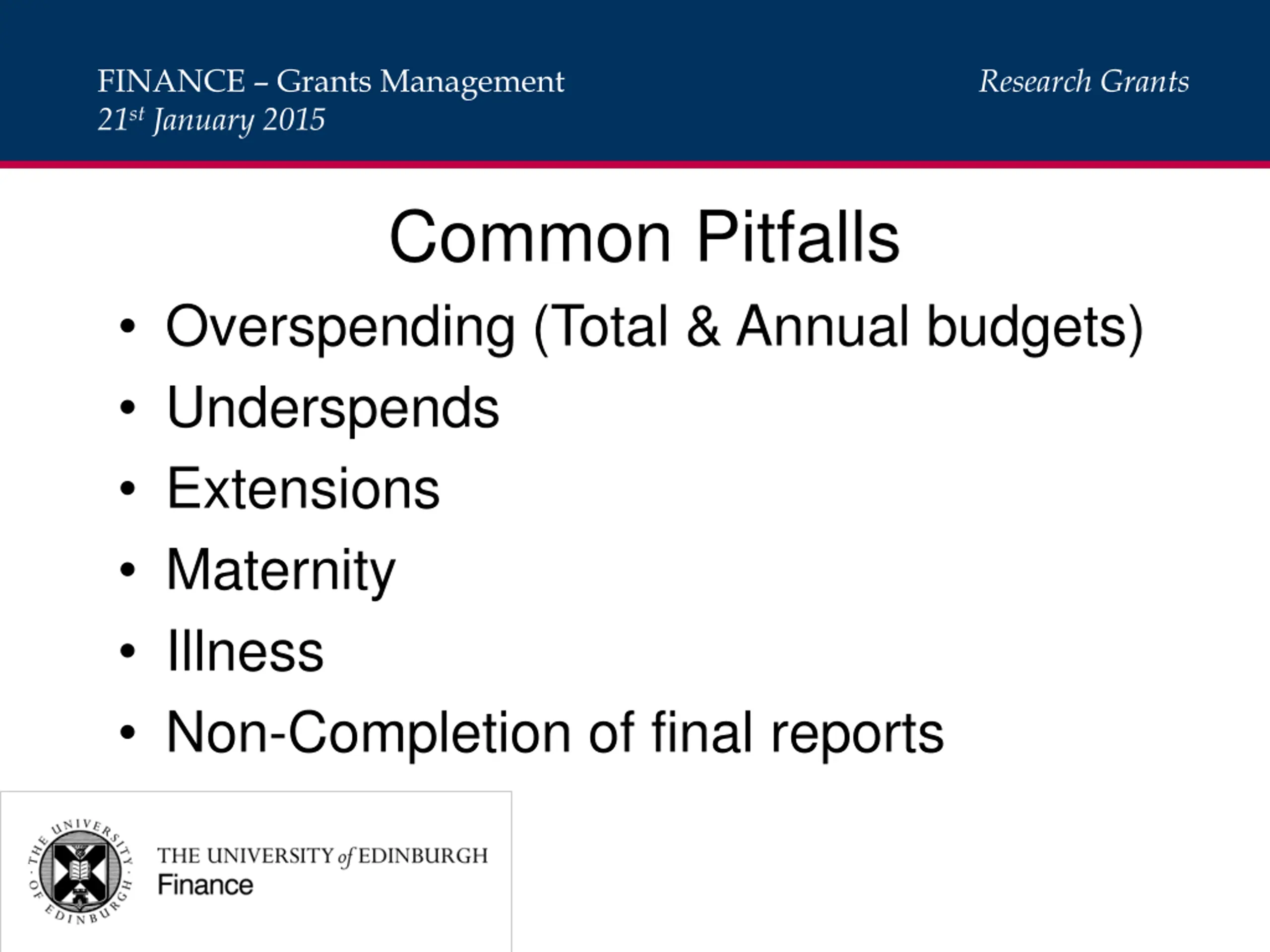 FINANCE Grants Management 21st January 2015 Research Grants Common Pitfalls Overspending (Total & Annual budgets) Underspends Extensions Maternity Illness Non-Completion of final reports