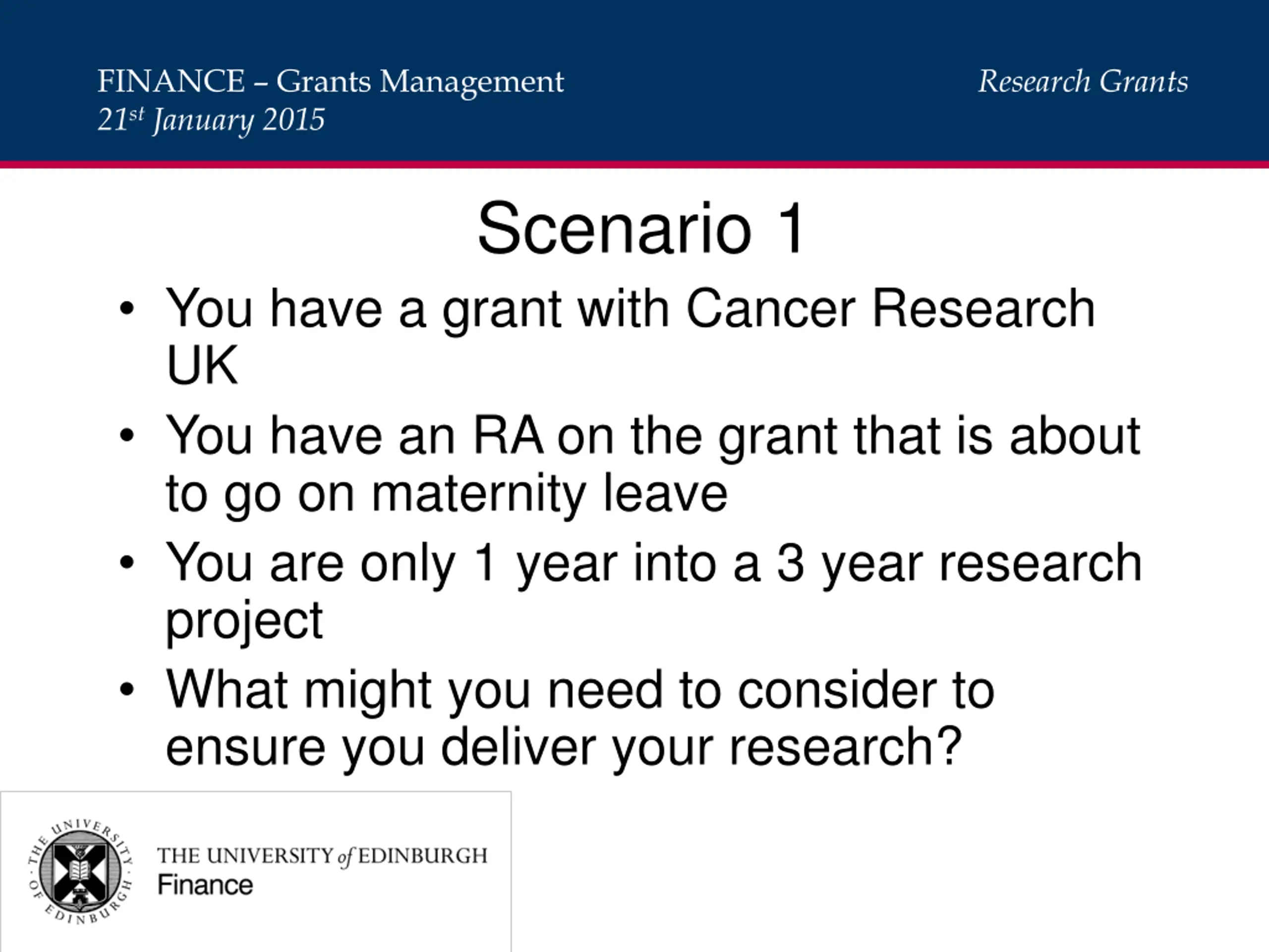 FINANCE Grants Management 21st January 2015 Research Grants Scenario 1 You have a grant with Cancer Research UK You have an RA on the grant that is about to go on maternity leave You are only 1 year into a 3 year research project What might you need to consider to ensure you deliver your research?