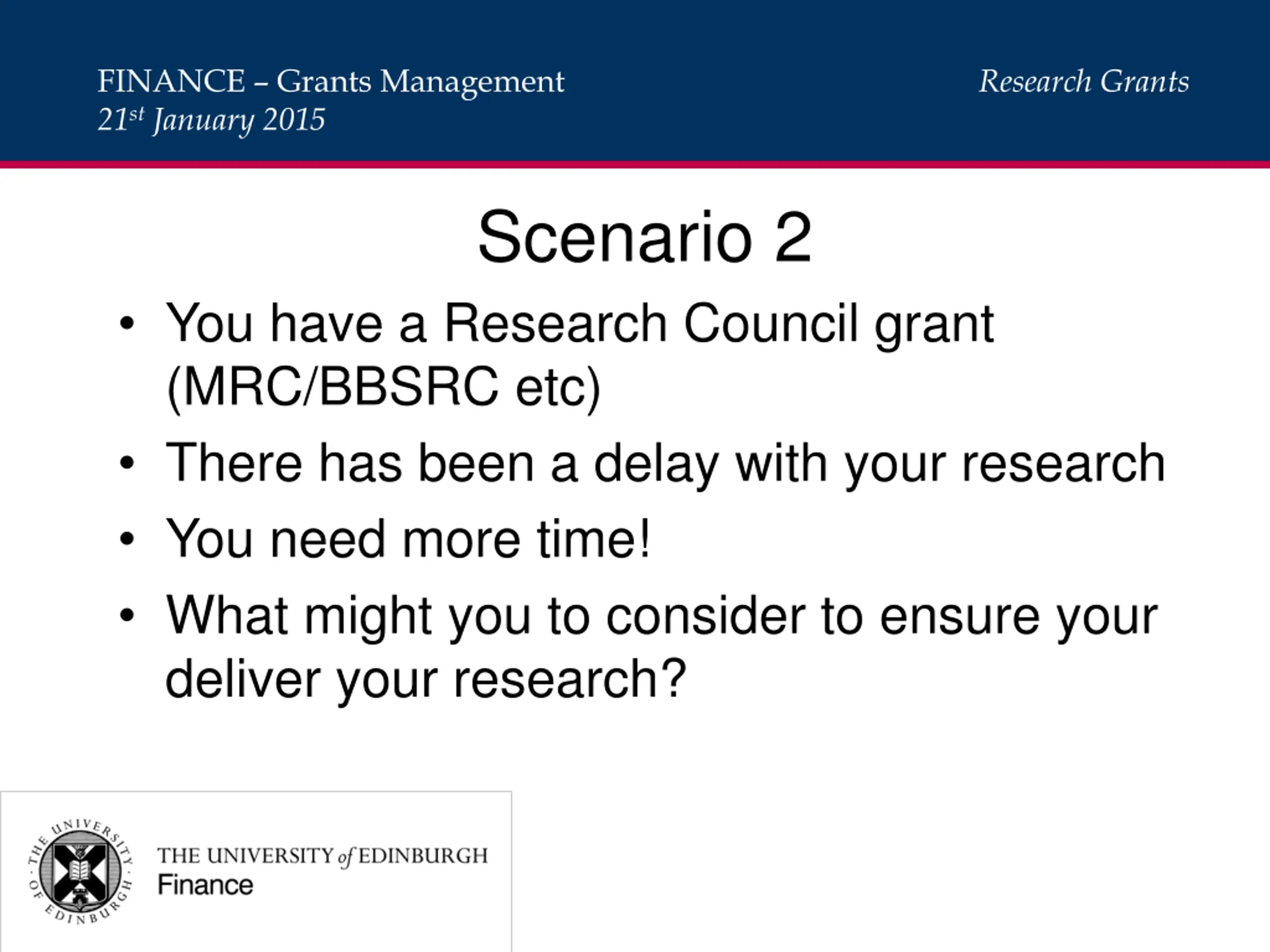 FINANCE Grants Management 21st January 2015 Research Grants Scenario 2 You have a Research Council grant (MRC/BBSRC etc) There has been a delay with your research You need more time! What might you to consider to ensure your deliver your research?