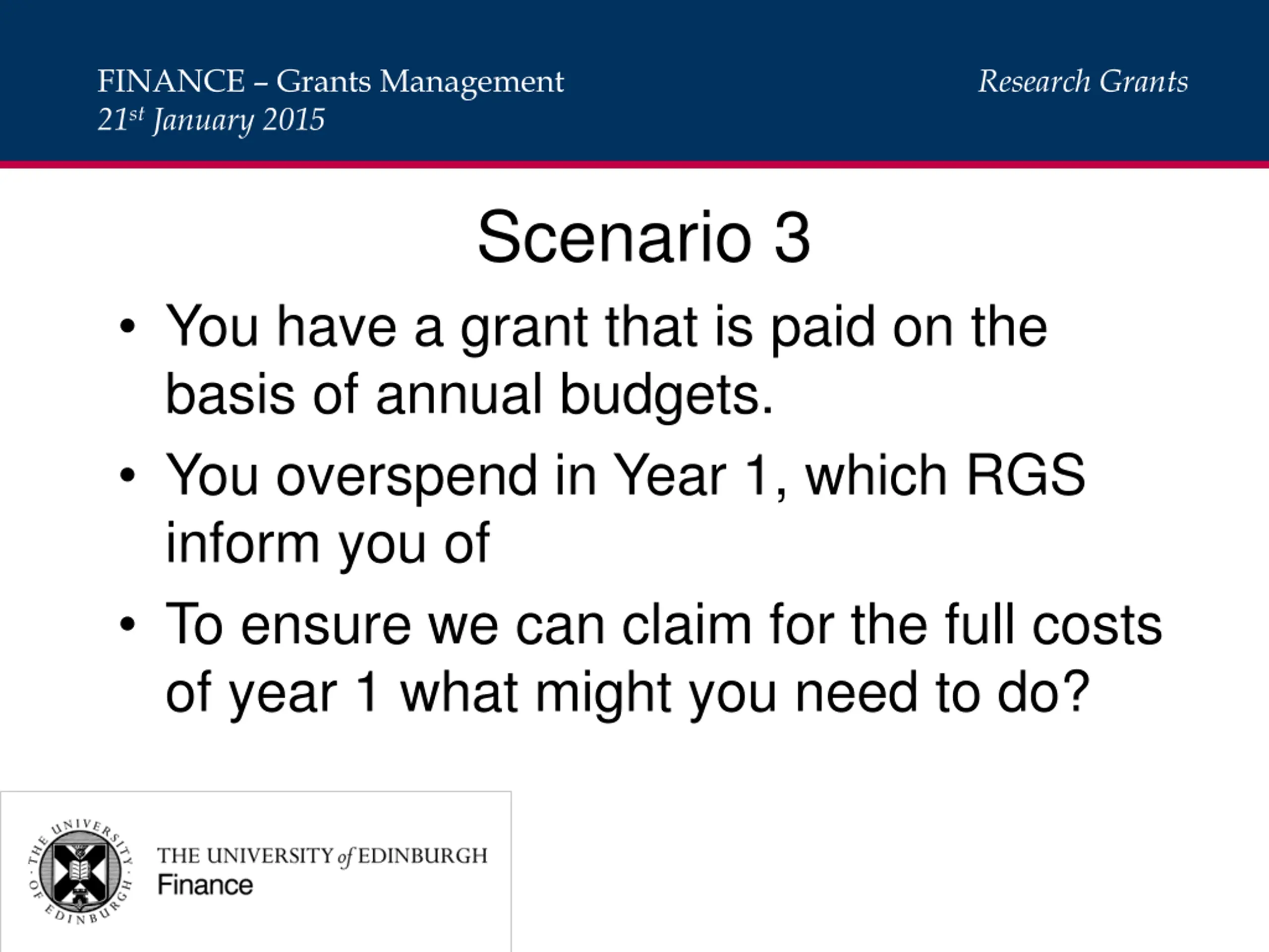 FINANCE Grants Management 21st January 2015 Research Grants Scenario 3 You have a grant that is paid on the basis of annual budgets. You overspend in Year 1, which RGS inform you of To ensure we can claim for the full costs of year 1 what might you need to do?