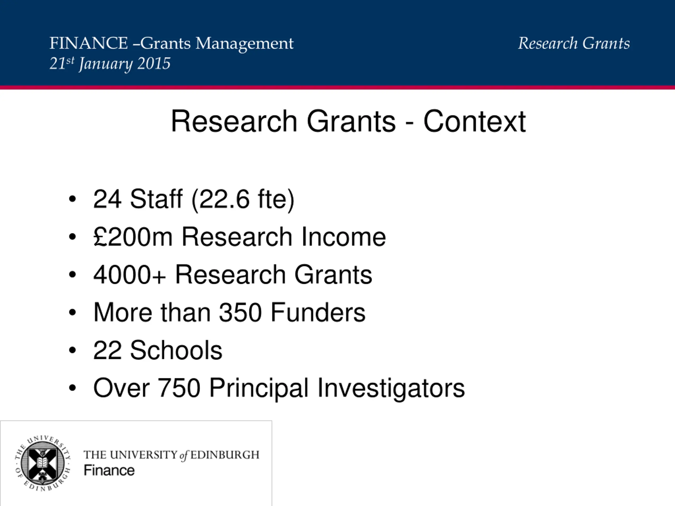FINANCE Grants Management 21st January 2015 Research Grants Research Grants - Context 24 Staff (22.6 fte) 200m Research Income 4000+ Research Grants More than 350 Funders 22 Schools Over 750 Principal Investigators