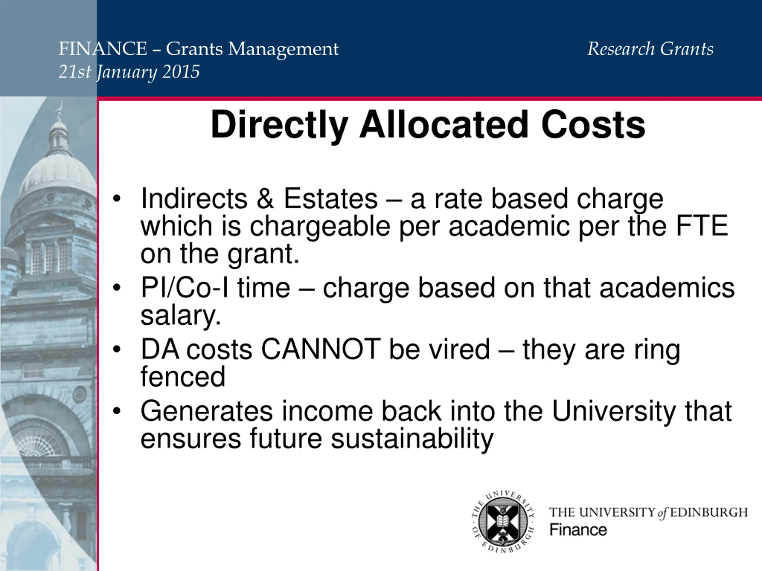 FINANCE Grants Management 21st January 2015 Research Grants Directly Allocated Costs Indirects & Estates a rate based charge which is chargeable per academic per the FTE on the grant. PI/Co-I time charge based on that academics salary. DA costs CANNOT be vired they are ring fenced Generates income back into the University that ensures future sustainability