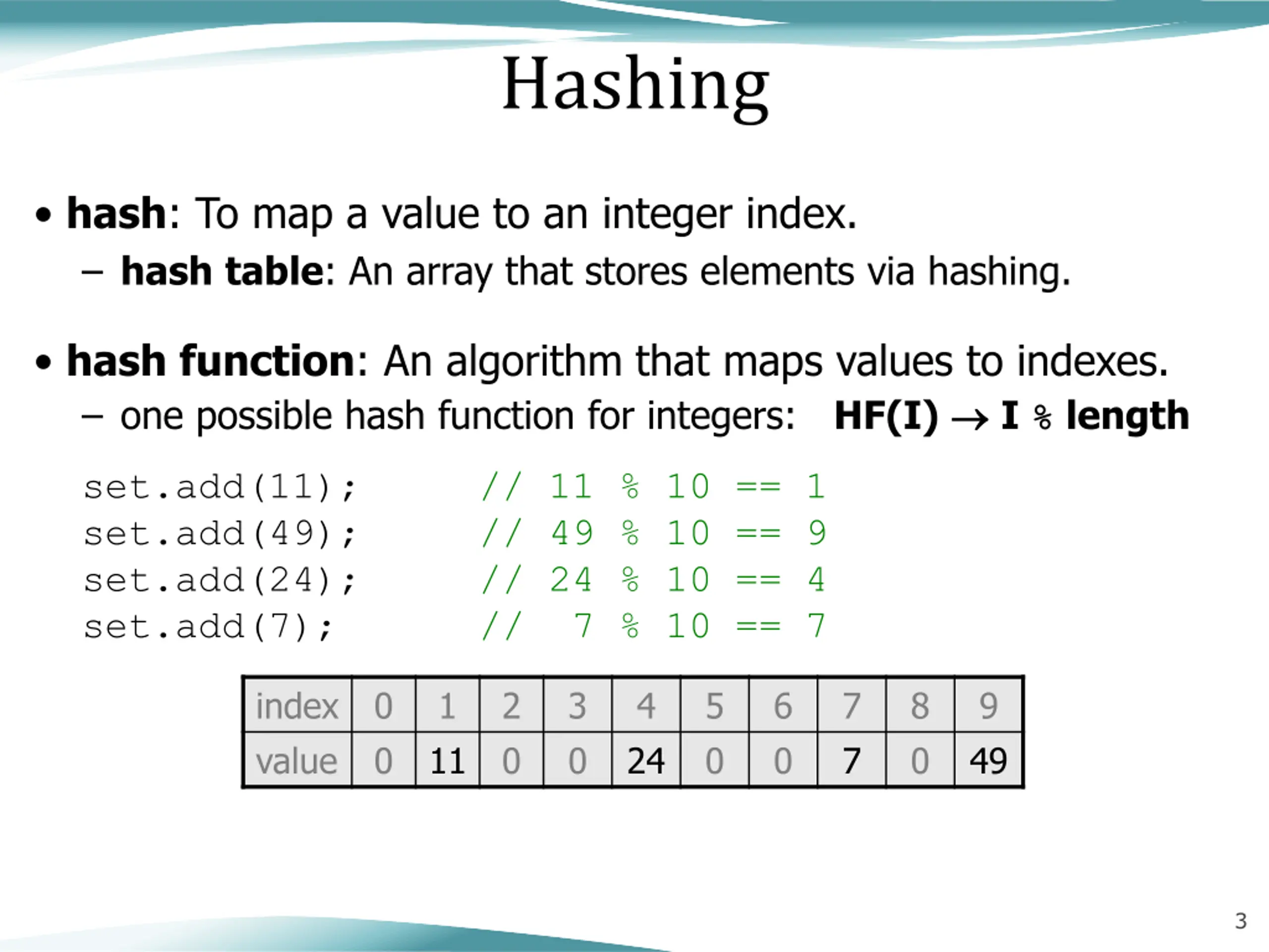 Hashing hash: To map a value to an integer index. hash table: An array that stores elements via hashing. hash function: An algorithm that maps values to indexes. one possible hash function for integers: HF(I) I % length set.add(11); set.add(49); set.add(24); set.add(7); // 11 % 10 == 1 // 49 % 10 == 9 // 24 % 10 == 4 // 7 % 10 == 7 index value 0 0 1 11 2 0 3 0 4 5 0 6 0 7 7 8 0 9 24 49 3