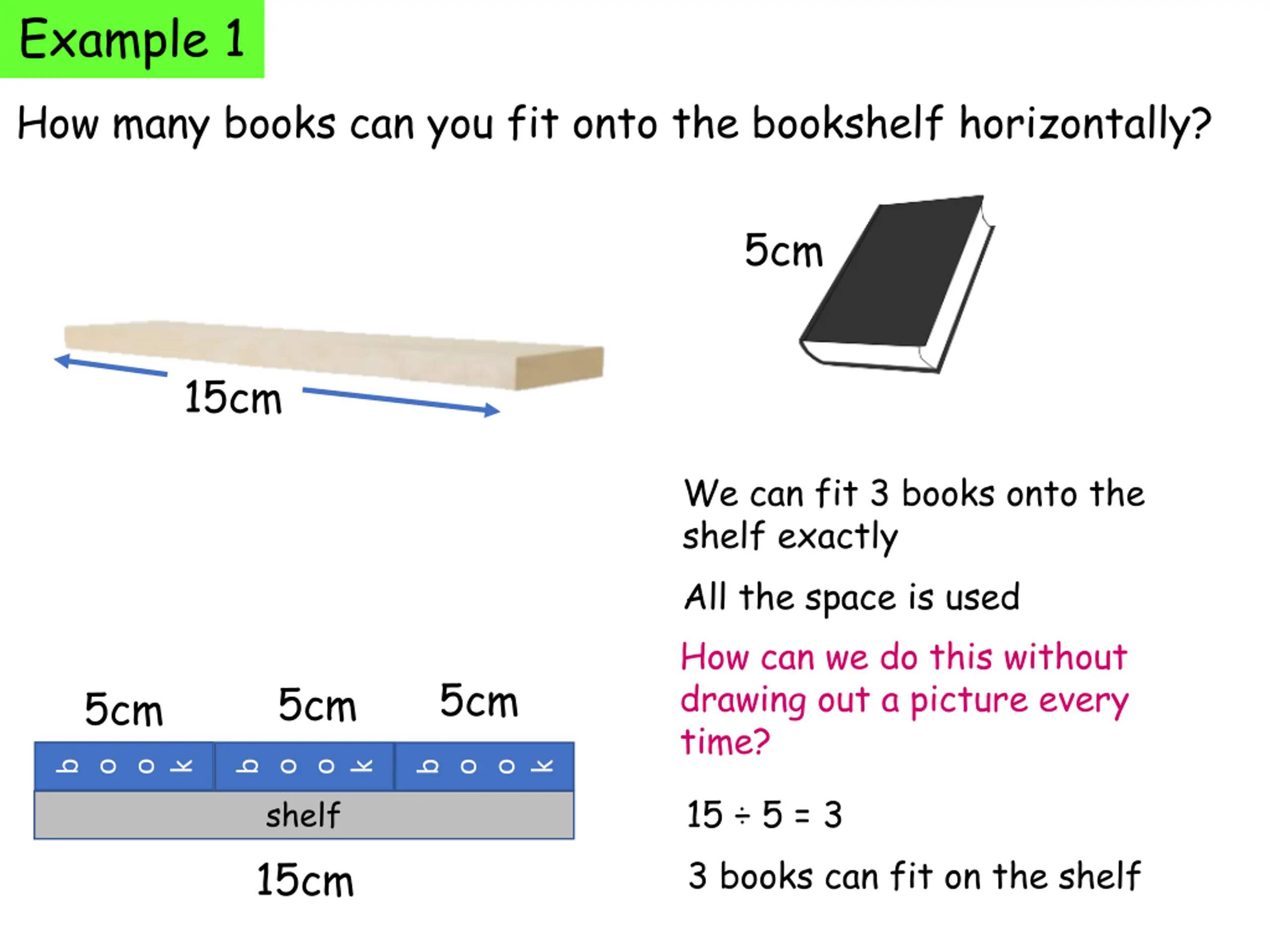 Example 1 How many books can you fit onto the bookshelf horizontally? 5cm 15cm We can fit 3 books onto the shelf exactly All the space is used How can we do this without drawing out a picture every time? 5cm 5cm 5cm o o b o o b o o b k k k 15 5 = 3 3 books can fit on the shelf shelf 15cm
