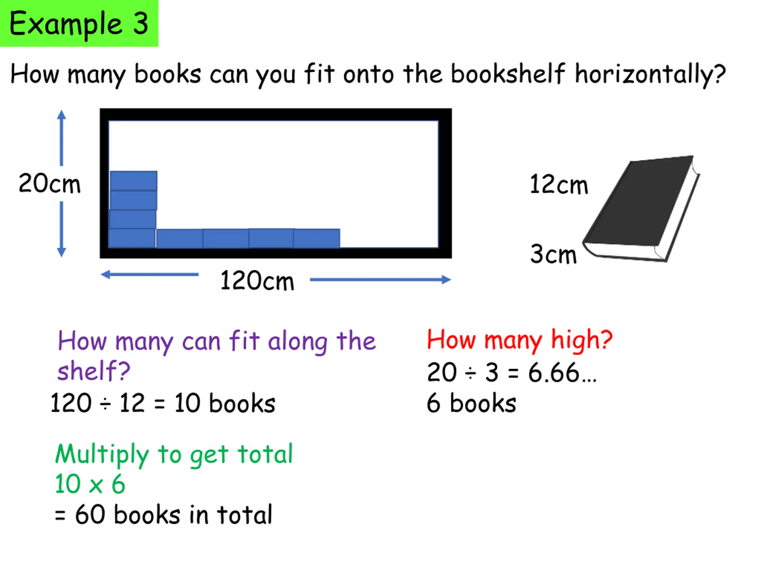 Example 3 How many books can you fit onto the bookshelf horizontally? 20cm 12cm 3cm 120cm How many high? 20 3 = 6.66 6 books How many can fit along the shelf? 120 12 = 10 books Multiply to get total 10 x 6 = 60 books in total