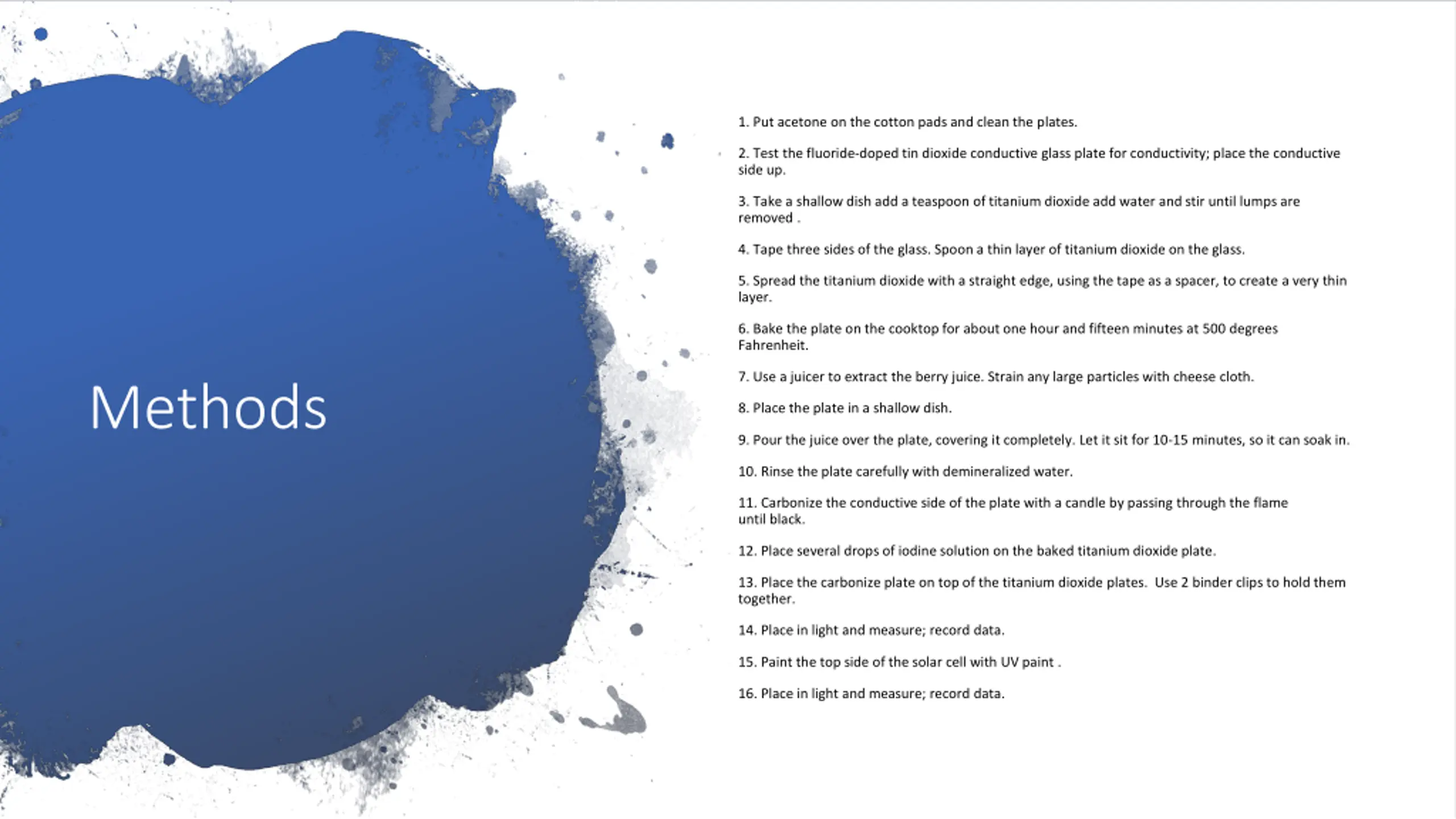 1. Put acetone on the cotton pads and clean the plates. 2. Test the fluoride-doped tin dioxide conductive glass plate for conductivity; place the conductive side up. 3. Take a shallow dish add a teaspoon of titanium dioxide add water and stir until lumps are removed . 4. Tape three sides of the glass. Spoon a thin layer of titanium dioxide on the glass. 5. Spread the titanium dioxide with a straight edge, using the tape as a spacer, to create a very thin layer. 6. Bake the plate on the cooktop for about one hour and fifteen minutes at 500 degrees Fahrenheit. 7. Use a juicer to extract the berry juice. Strain any large particles with cheese cloth. Methods 8. Place the plate in a shallow dish. 9. Pour the juice over the plate, covering it completely. Let it sit for 10-15 minutes, so it can soak in. 10. Rinse the plate carefully with demineralized water. 11. Carbonize the conductive side of the plate with a candle by passing through the flame until black. 12. Place several drops of iodine solution on the baked titanium dioxide plate. 13. Place the carbonize plate on top of the titanium dioxide plates. Use 2 binder clips to hold them together. 14. Place in light and measure; record data. 15. Paint the top side of the solar cell with UV paint . 16. Place in light and measure; record data.