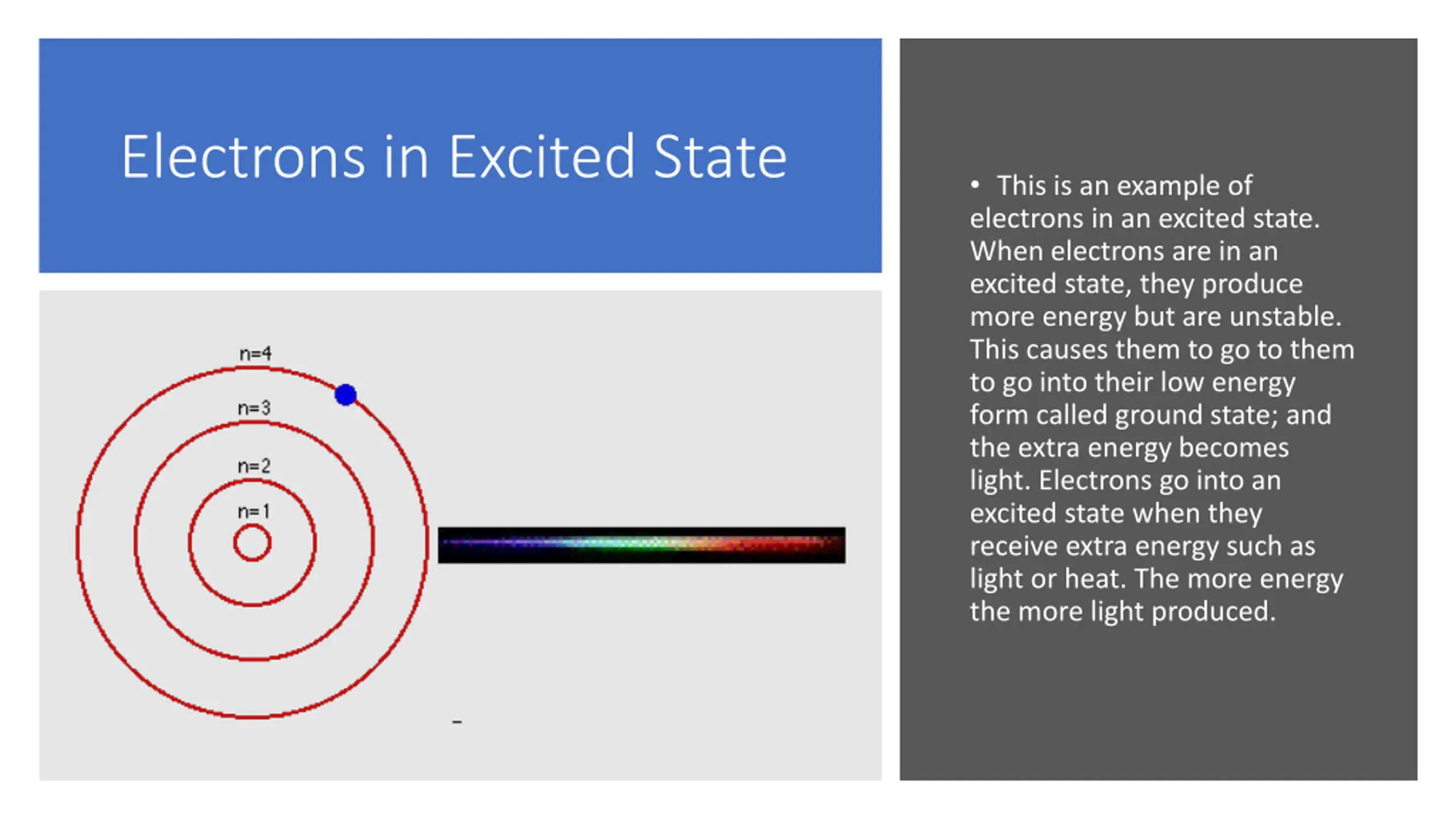 Electrons in Excited State This is an example of electrons in an excited state. When electrons are in an excited state, they produce more energy but are unstable. This causes them to go to them to go into their low energy form called ground state; and the extra energy becomes light. Electrons go into an excited state when they receive extra energy such as light or heat. The more energy the more light produced.