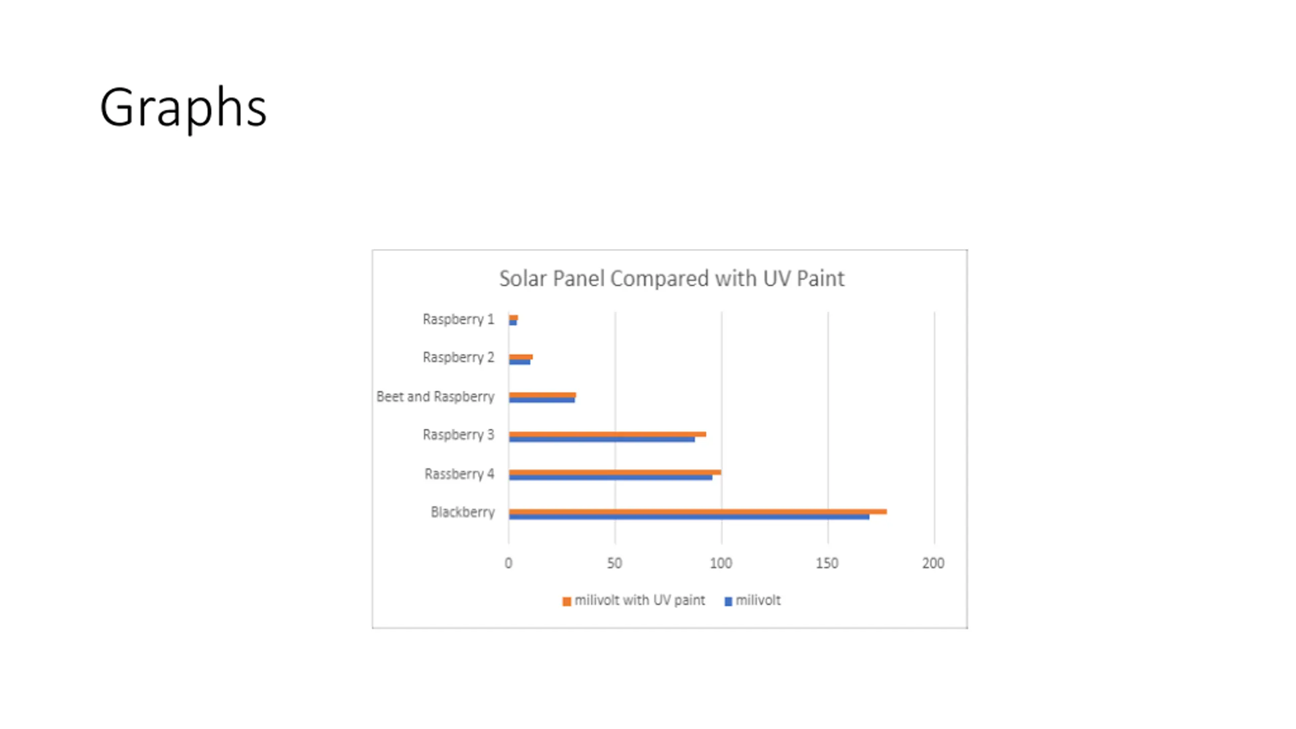 Hypothesis It is hypothesized that the paint will increase the efficiency of the cell because it will turn the UV light and make more visible light for the solar cell to absorb and create energy. It is hypothesized that blackberries will do the best since they do better in low light levels so they might be more efficient.