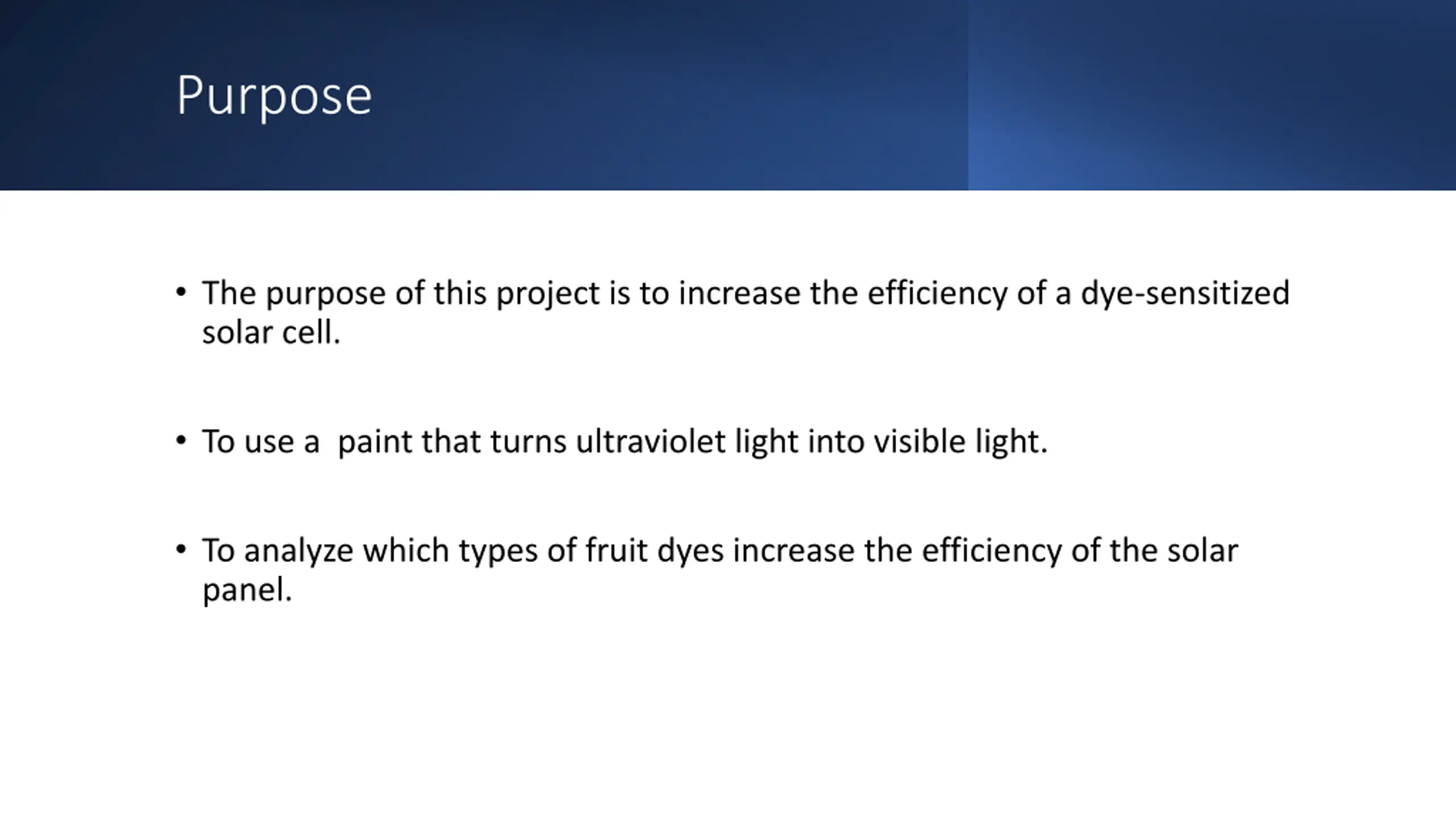 Purpose The purpose of this project is to increase the efficiency of a dye-sensitized solar cell. To use a paint that turns ultraviolet light into visible light. To analyze which types of fruit dyes increase the efficiency of the solar panel.