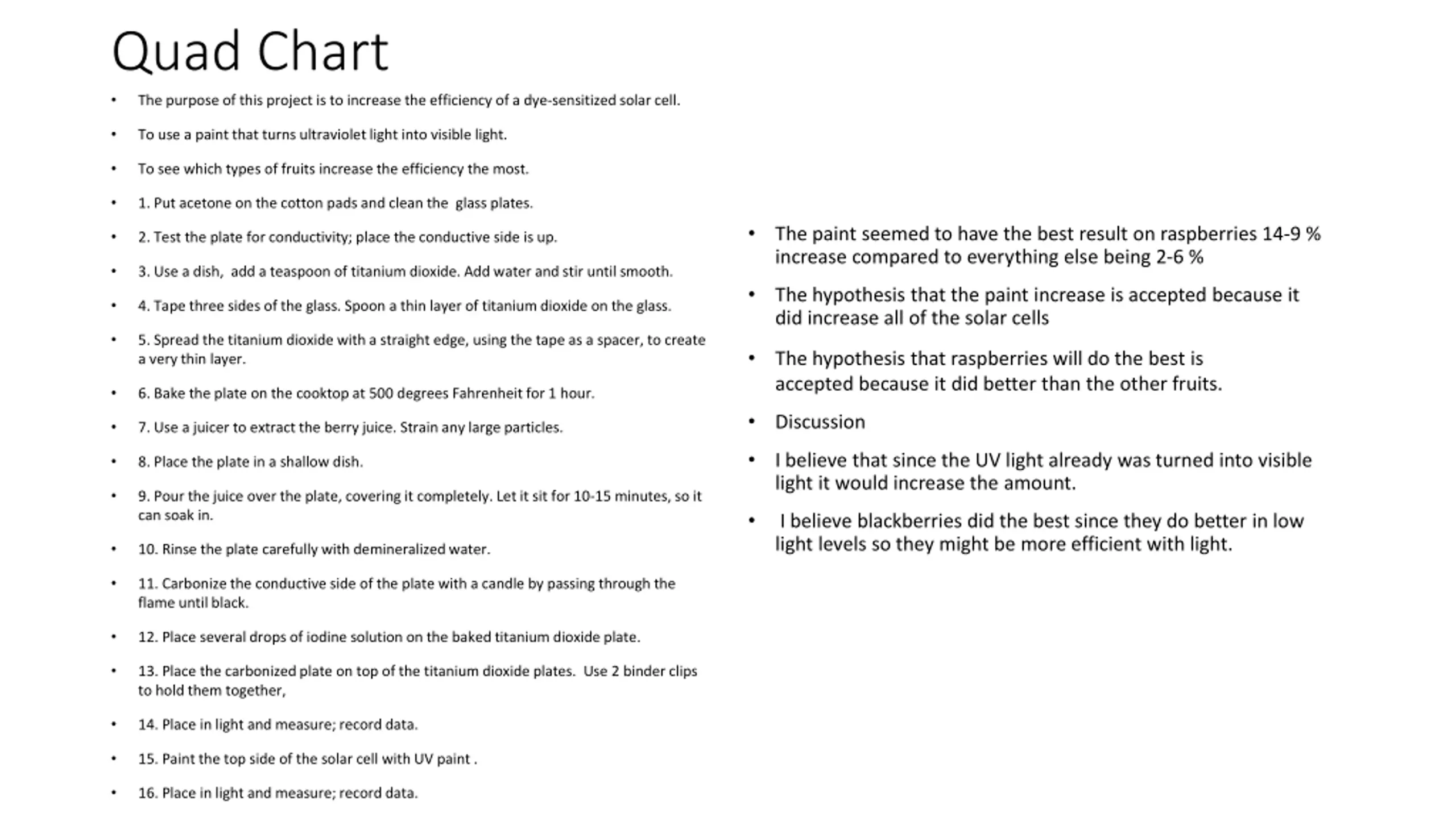 Quad Chart The purpose of this project is to increase the efficiency of a dye-sensitized solar cell. To use a paint that turns ultravioletlight into visible light. To see which types of fruits increase the efficiency the most. 1. Put acetone on the cotton pads and clean the glass plates. The paint seemed to have the best result on raspberries 14-9 % increase compared to everything else being 2-6 % 2. Test the plate for conductivity; place the conductive side is up. 3. Use a dish, add a teaspoon of titanium dioxide. Add water and stir until smooth. The hypothesis that the paint increase is accepted because it did increase all of the solar cells 4. Tape three sides of the glass. Spoon a thin layer of titanium dioxide on the glass. 5. Spread the titanium dioxide with a straight edge, using the tape as a spacer, to create a very thin layer. The hypothesis that raspberries will do the best is accepted because it did better than the other fruits. 6. Bake the plate on the cooktop at 500 degrees Fahrenheit for 1 hour. Discussion 7. Use a juicer to extract the berry juice. Strain any large particles. I believe that since the UV light already was turned into visible light it would increase the amount. 8. Place the plate in a shallow dish. 9. Pour the juice over the plate, covering it completely. Let it sit for 10-15 minutes, so it can soak in. I believe blackberries did the best since they do better in low light levels so they might be more efficient with light. 10. Rinse the plate carefully with demineralized water. 11. Carbonize the conductive side of the plate with a candle by passing through the flame until black. 12. Place several drops of iodine solution on the baked titanium dioxide plate. 13. Place the carbonized plate on top of the titanium dioxide plates. Use 2 binder clips to hold them together, 14. Place in light and measure; record data. 15. Paint the top side of the solar cell with UV paint . 16. Place in light and measure; record data.