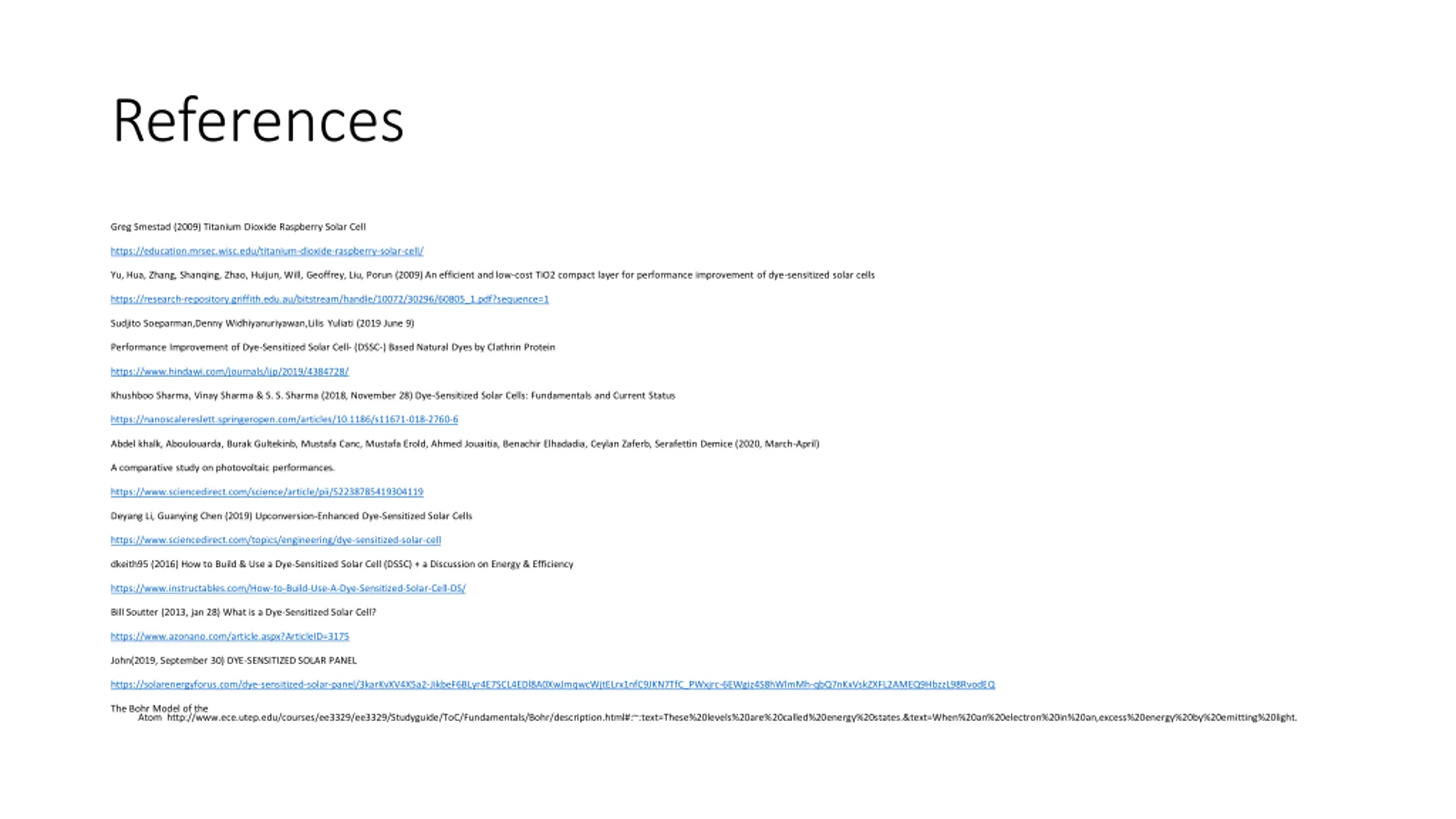 References Greg Smestad (2009) Titanium Dioxide Raspberry Solar Cell https://education.mrsec.wisc.edu/titanium-dioxide-raspberry-solar-cell/ Yu, Hua, Zhang, Shanqing, Zhao, Huijun, Will, Geoffrey, Liu, Porun (2009) An efficient and low-cost TiO2 compact layer for performance improvement of dye-sensitized solar cells https://research-repository.griffith.edu.au/bitstream/handle/10072/30296/60805_1.pdf?sequence=1 Sudjito Soeparman,Denny Widhiyanuriyawan,Lilis Yuliati (2019 June 9) Performance Improvement of Dye-Sensitized Solar Cell- (DSSC-) Based Natural Dyes by Clathrin Protein https://www.hindawi.com/journals/ijp/2019/4384728/ Khushboo Sharma, Vinay Sharma & S. S. Sharma (2018, November 28) Dye-Sensitized Solar Cells: Fundamentals and Current Status https://nanoscalereslett.springeropen.com/articles/10.1186/s11671-018-2760-6 Abdel khalk, Aboulouarda, Burak Gultekinb, Mustafa Canc, Mustafa Erold, Ahmed Jouaitia, Benachir Elhadadia, Ceylan Zaferb, Serafettin Demice (2020, March-April) A comparative study on photovoltaic performances. https://www.sciencedirect.com/science/article/pii/S2238785419304119 Deyang Li, Guanying Chen (2019) Upconversion-Enhanced Dye-Sensitized Solar Cells https://www.sciencedirect.com/topics/engineering/dye-sensitized-solar-cell dkeith95 (2016) How to Build & Use a Dye-Sensitized Solar Cell (DSSC) + a Discussion on Energy & Efficiency https://www.instructables.com/How-to-Build-Use-A-Dye-Sensitized-Solar-Cell-DS/ Bill Soutter (2013, jan 28) What is a Dye-Sensitized Solar Cell? https://www.azonano.com/article.aspx?ArticleID=3175 John(2019, September 30) DYE-SENSITIZED SOLAR PANEL https://solarenergyforus.com/dye-sensitized-solar-panel/3karKvXV4X5a2-JikbeF6BLyr4E7SCL4EDl8A0XwJmqwcWjtELrx1nfC9JKN7TfC_PWxjrc-6EWgiz4S8hWlmMh-qbQ7nKxVskZXFL2AMEQ9HbzzL98RvodEQ The Bohr Model of the Atom http://www.ece.utep.edu/courses/ee3329/ee3329/Studyguide/ToC/Fundamentals/Bohr/description.html#:~:text=These%20levels%20are%20called%20energy%20states.&text=When%20an%20electron%20in%20an,excess%20energy%20by%20emitting%20light.