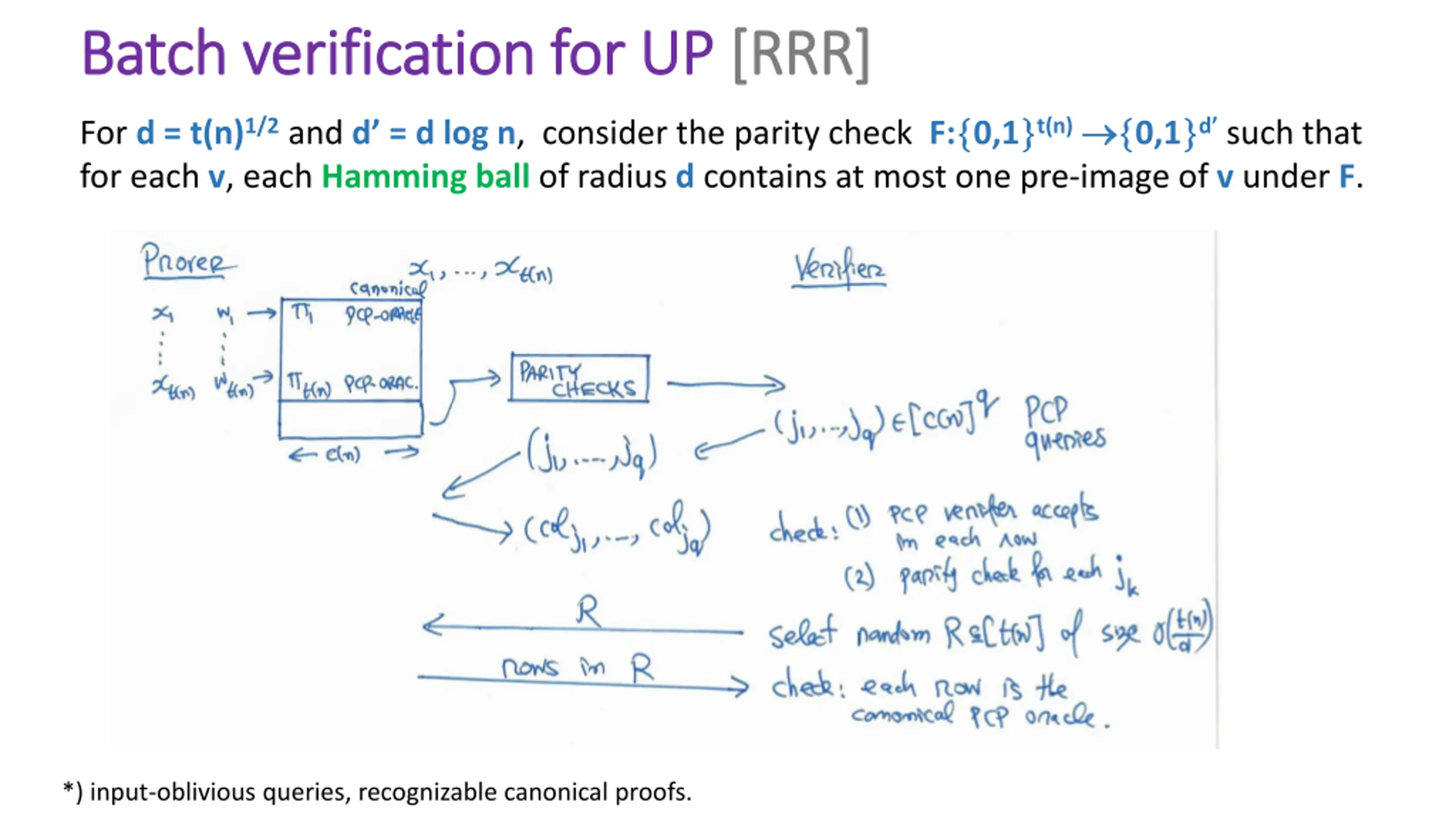 Batch verification for UP Batch verification for UP [RRR] For d = t(n)1/2and d = d log n, consider the parity check F: 0,1 t(n) for each v, each Hamming ball of radius d contains at most one pre-image of v under F. [RRR] 0,1 d such that *) input-oblivious queries, recognizable canonical proofs.