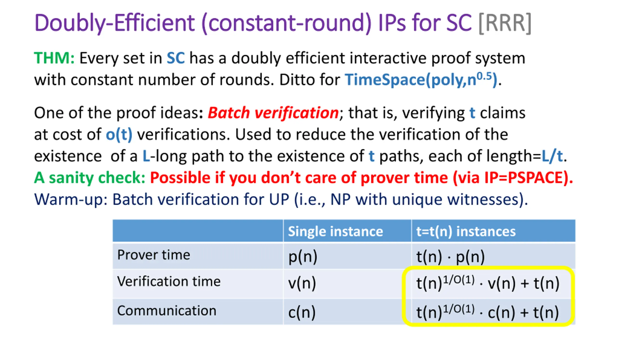 D Doubly oubly- -Efficient (constant Efficient (constant- -round) IPs for round) IPs for S SC C [RRR] [RRR] THM: Every set in SC has a doubly efficient interactive proof system with constant number of rounds. Ditto for TimeSpace(poly,n0.5). One of the proof ideas: Batch verification; that is, verifying t claims at cost of o(t) verifications. Used to reduce the verification of the existence of a L-long path to the existence of t paths, each of length=L/t. A sanity check: Possible if you don t care of prover time (via IP=PSPACE). Warm-up: Batch verification for UP (i.e., NP with unique witnesses). Single instance p(n) v(n) t=t(n) instances t(n) p(n) t(n)1/O(1) v(n) + t(n) t(n)1/O(1) c(n) + t(n) Prover time Verification time Communication c(n)
