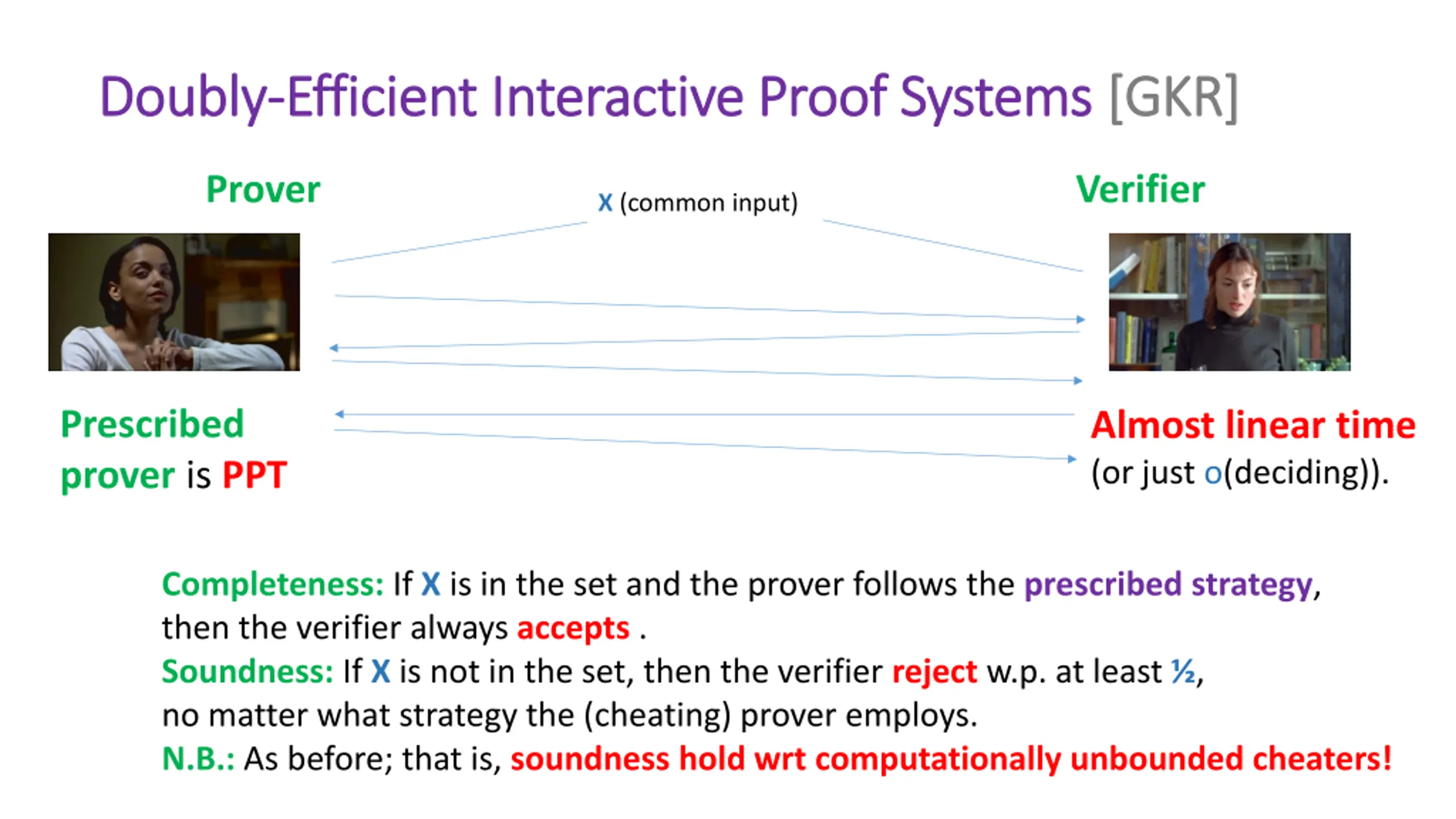 Doubly Doubly- -Efficient Interactive Proof Systems Efficient Interactive Proof Systems [GKR] [GKR] Prover Verifier X (common input) Prescribed prover is PPT Almost linear time (or just o(deciding)). Completeness: If X is in the set and the prover follows the prescribed strategy, then the verifier always accepts . Soundness: If X is not in the set, then the verifier reject w.p. at least , no matter what strategy the (cheating) prover employs. N.B.: As before; that is, soundness hold wrt computationally unbounded cheaters!