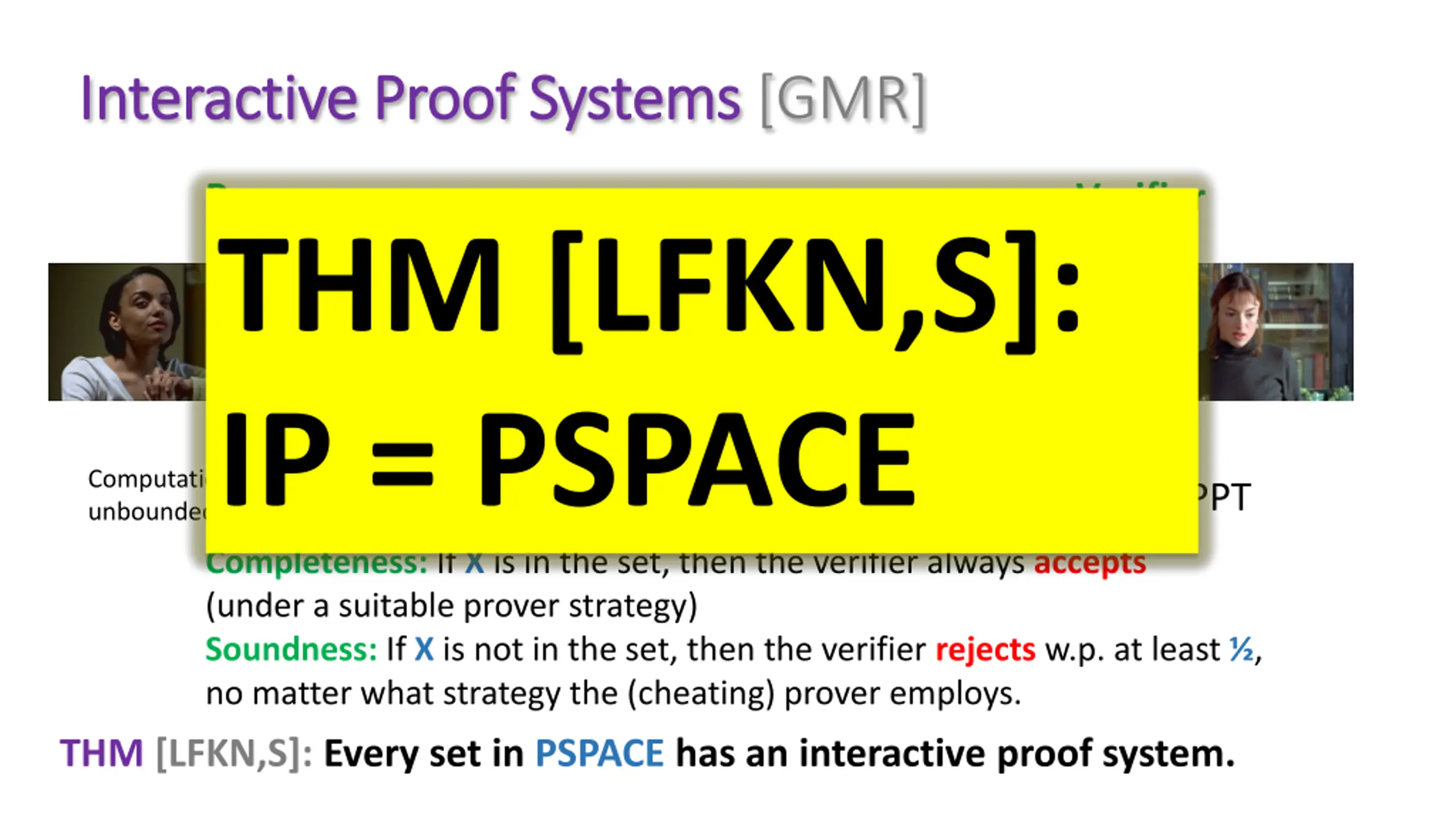 Interactive Proof Systems Interactive Proof Systems [GMR] Prover THM [LFKN,S]: IP = PSPACE Verifier X (common input) Computationally unbounded PPT Completeness: If X is in the set, then the verifier always accepts (under a suitable prover strategy) Soundness: If X is not in the set, then the verifier rejects w.p. at least , no matter what strategy the (cheating) prover employs. THM [LFKN,S]: Every set in PSPACE has an interactive proof system.