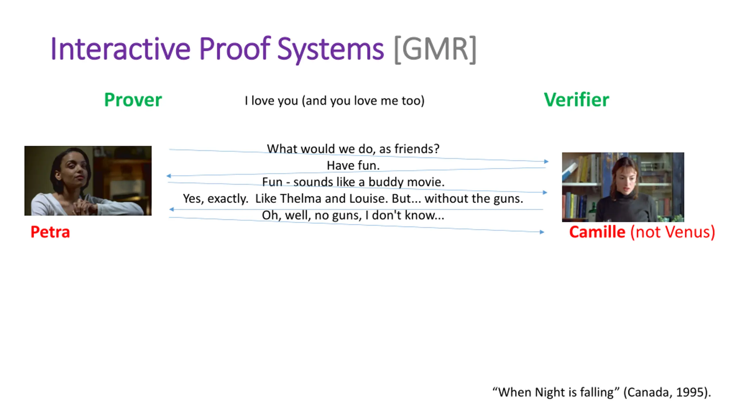 Interactive Proof Systems Interactive Proof Systems [GMR] [GMR] Prover Verifier I love you (and you love me too) What would we do, as friends? Have fun. Fun - sounds like a buddy movie. Yes, exactly. Like Thelma and Louise. But... without the guns. Oh, well, no guns, I don't know... Petra Camille (not Venus) When Night is falling (Canada, 1995).