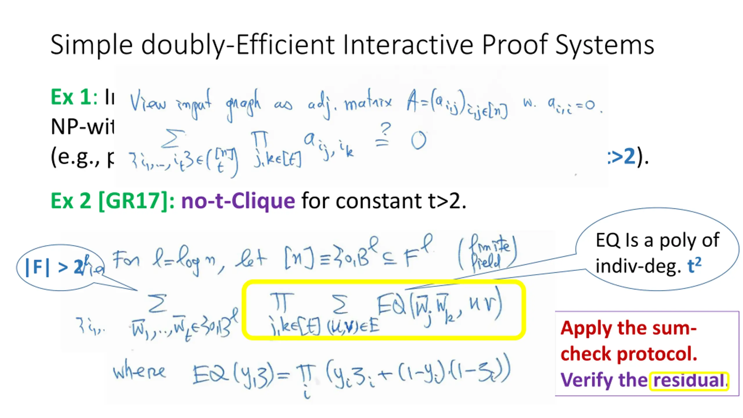 Simple doubly-Efficient Interactive Proof Systems Ex 1: In some cases, (almost linear-time verifiable) NP-witnesses can be found in polynomial-time (e.g., perfect matching, primality, t-Clique for constant t>2). Ex 2 [GR17]: no-t-Clique for constant t>2. EQ Is a poly of indiv-deg. t2 |F| > 2ll Apply the sum- check protocol. Verify the residual.