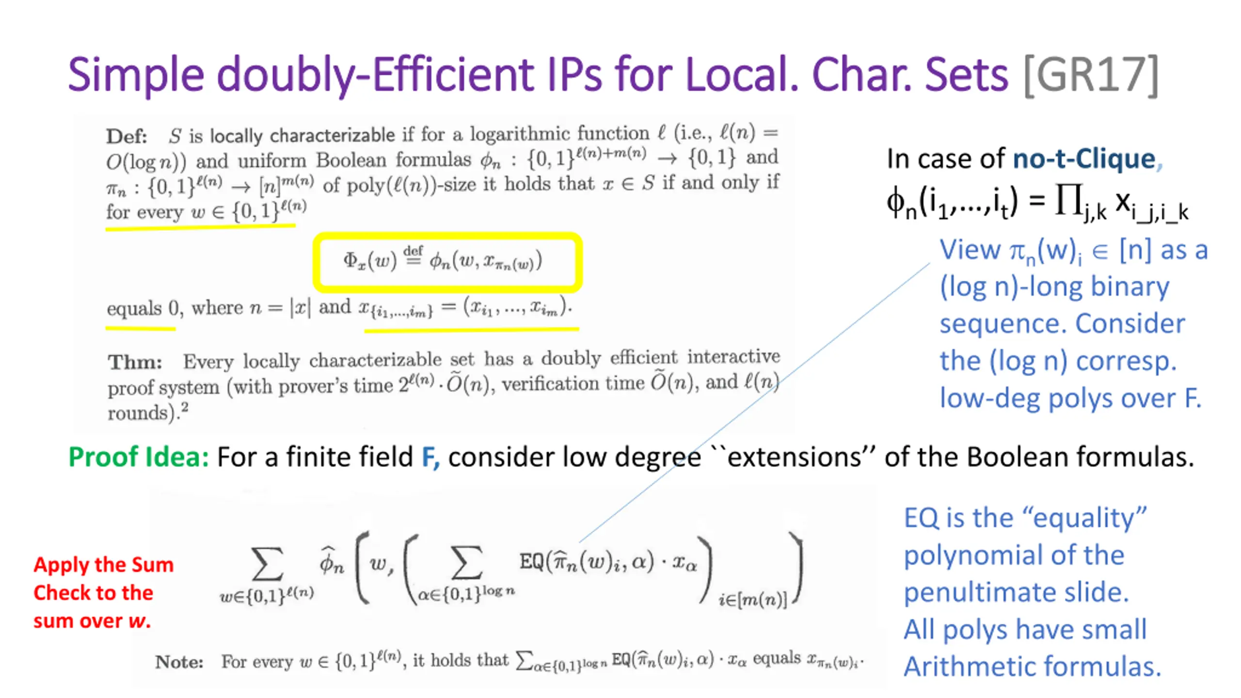 Simple doubly Simple doubly- -Efficient IPs for Local. Char. Sets Efficient IPs for Local. Char. Sets [GR17] [GR17] In case of no-t-Clique, n(i1, ,it) = j,k xi_j,i_k View n(w)i [n] as a (log n)-long binary sequence. Consider the (log n) corresp. low-deg polys over F. Proof Idea: For a finite field F,consider low degree ``extensions of the Boolean formulas. EQ is the equality polynomial of the penultimate slide. All polys have small Arithmetic formulas. Apply the Sum Check to the sum over w.