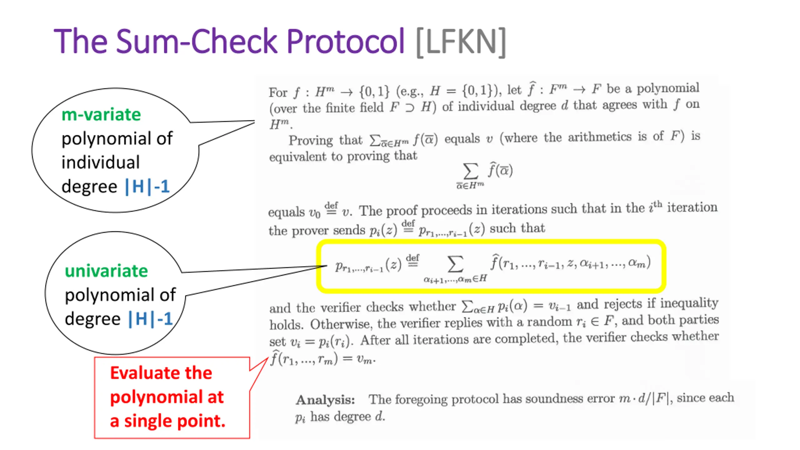T The Sum he Sum- -Check Protocol Check Protocol [LFKN] [LFKN] m-variate polynomial of individual degree |H|-1 univariate polynomial of degree |H|-1 Evaluate the polynomial at a single point.