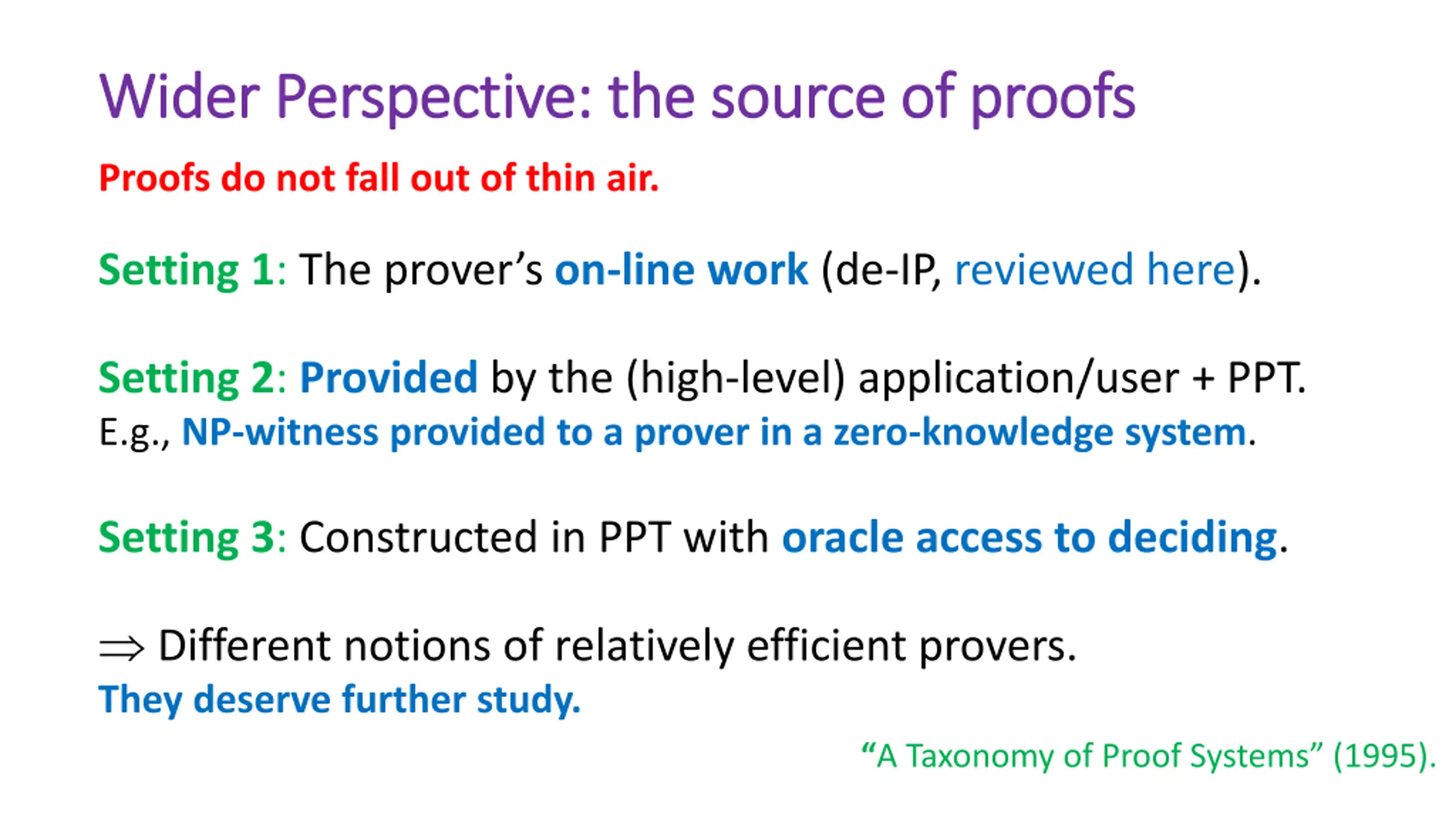 Wider Perspective: the source of proofs Wider Perspective: the source of proofs Proofs do not fall out of thin air. Setting 1: The prover s on-line work (de-IP, reviewed here). Setting 2: Provided by the (high-level) application/user + PPT. E.g., NP-witness provided to a prover in a zero-knowledge system. Setting 3: Constructed in PPT with oracle access to deciding. Different notions of relatively efficient provers. They deserve further study. A Taxonomy of Proof Systems (1995).