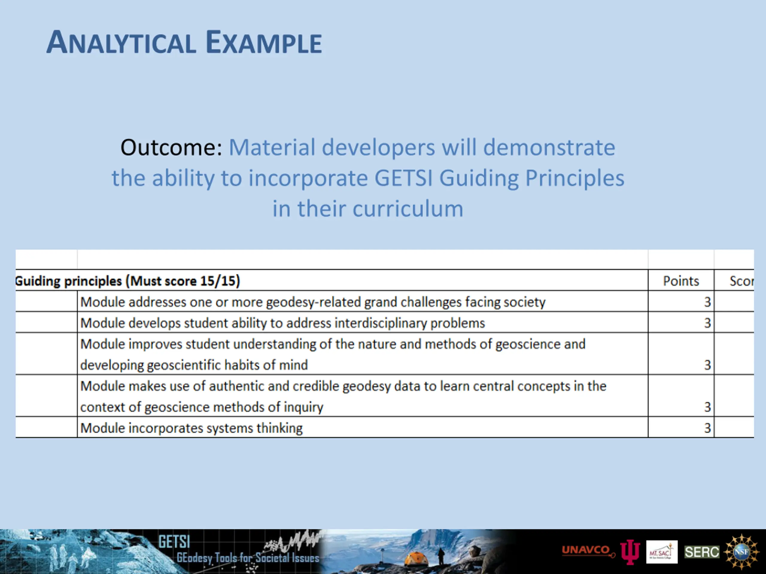 ANALYTICAL EXAMPLE Outcome: Material developers will demonstrate the ability to incorporate GETSI Guiding Principles in their curriculum