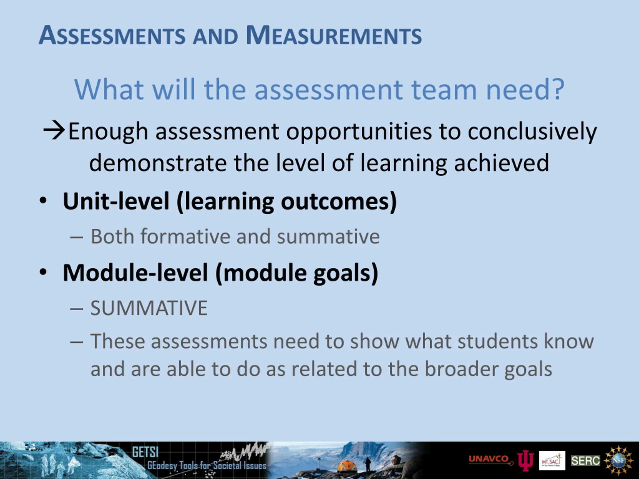 ASSESSMENTSAND MEASUREMENTS What will the assessment team need? Enough assessment opportunities to conclusively demonstrate the level of learning achieved Unit-level (learning outcomes) Both formative and summative Module-level (module goals) SUMMATIVE These assessments need to show what students know and are able to do as related to the broader goals