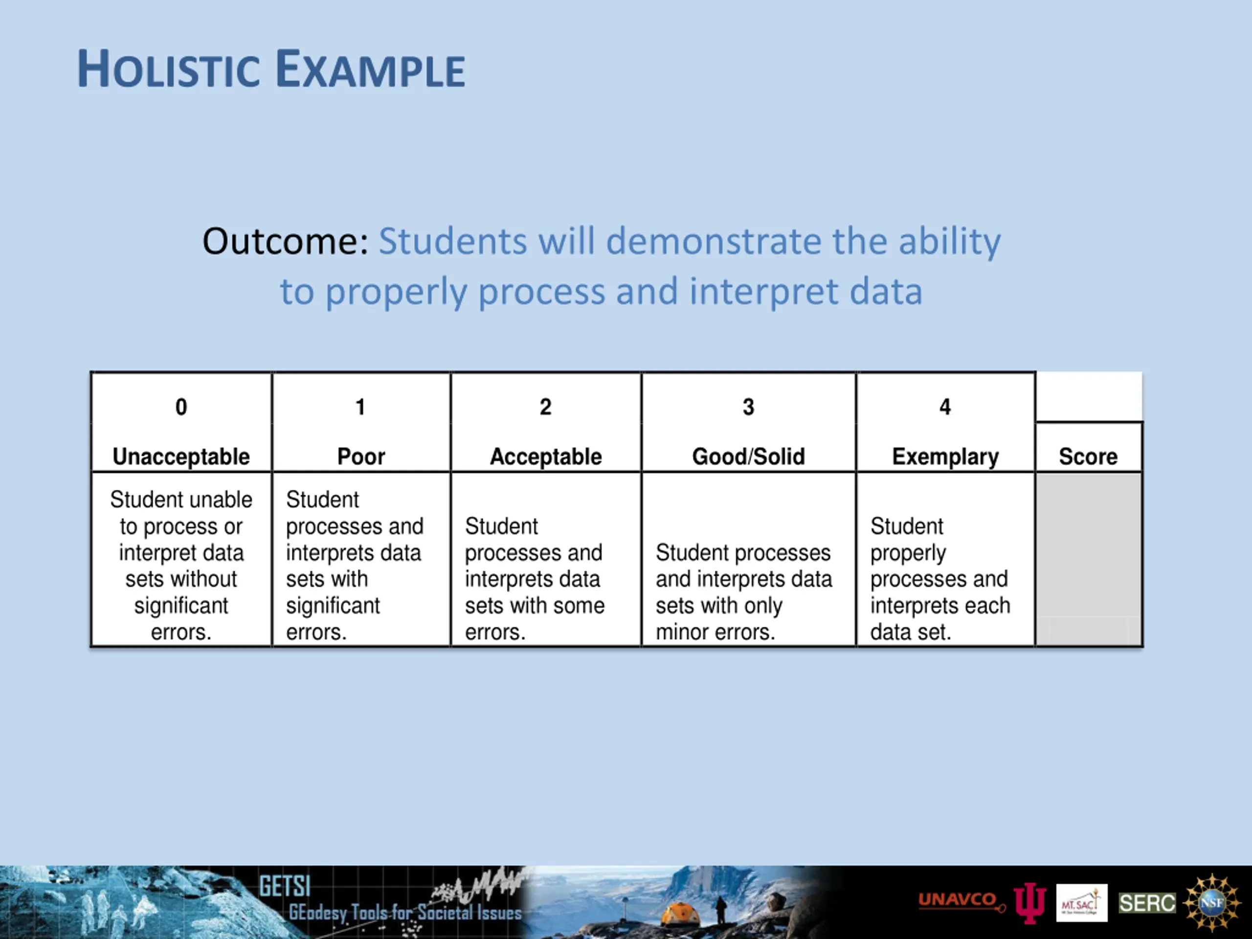 HOLISTIC EXAMPLE Outcome: Students will demonstrate the ability to properly process and interpret data 0 1 2 3 4 Unacceptable Poor Acceptable Good/Solid Exemplary Score Student unable to process or interpret data sets without significant errors. Student processes and interprets data sets with significant errors. Student processes and interprets data sets with some errors. Student properly processes and interprets each data set. Student processes and interprets data sets with only minor errors.