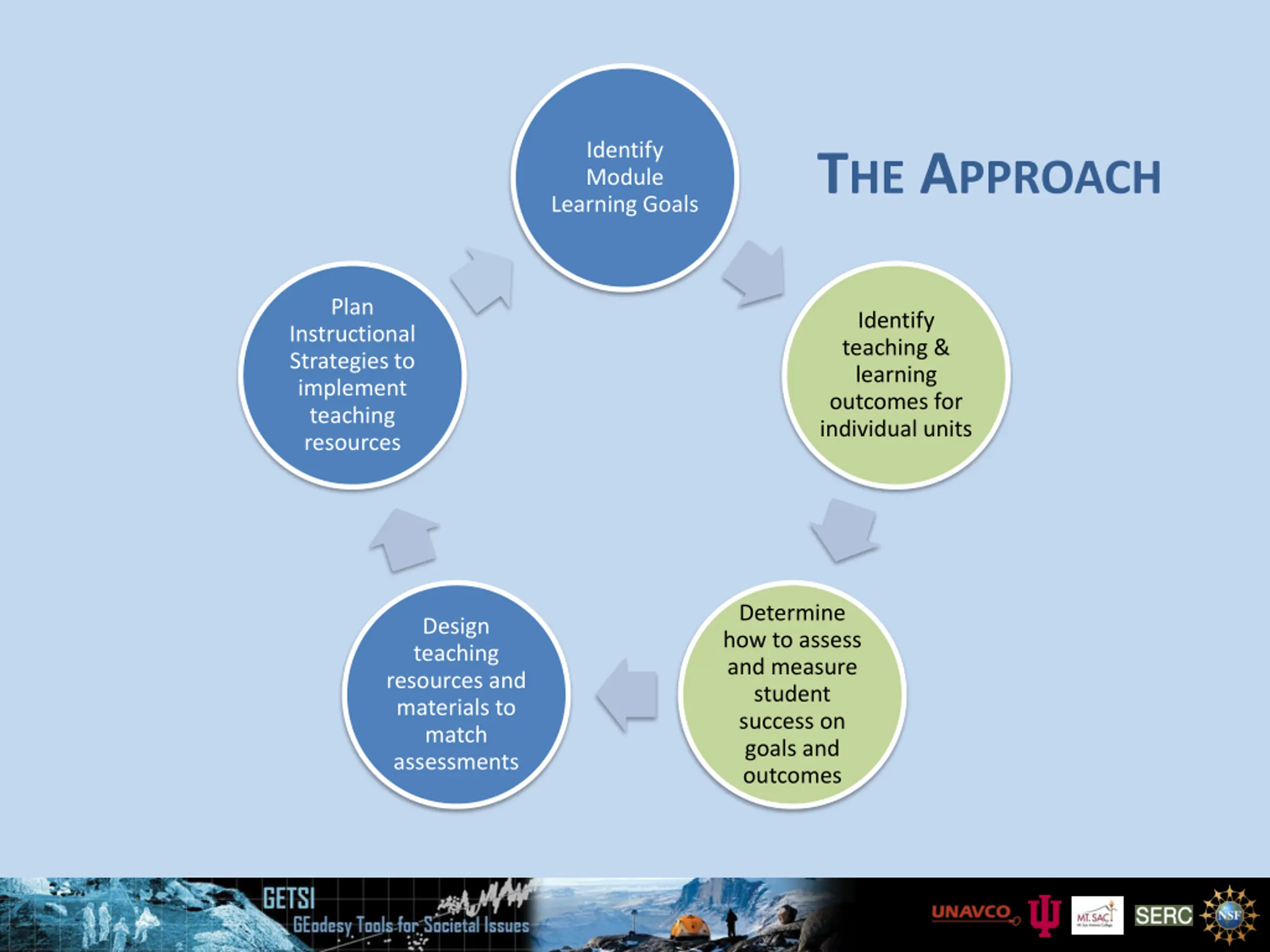Identify Module Learning Goals THE APPROACH Plan Identify teaching & learning outcomes for individual units Instructional Strategies to implement teaching resources Determine how to assess and measure student success on goals and outcomes Design teaching resources and materials to match assessments