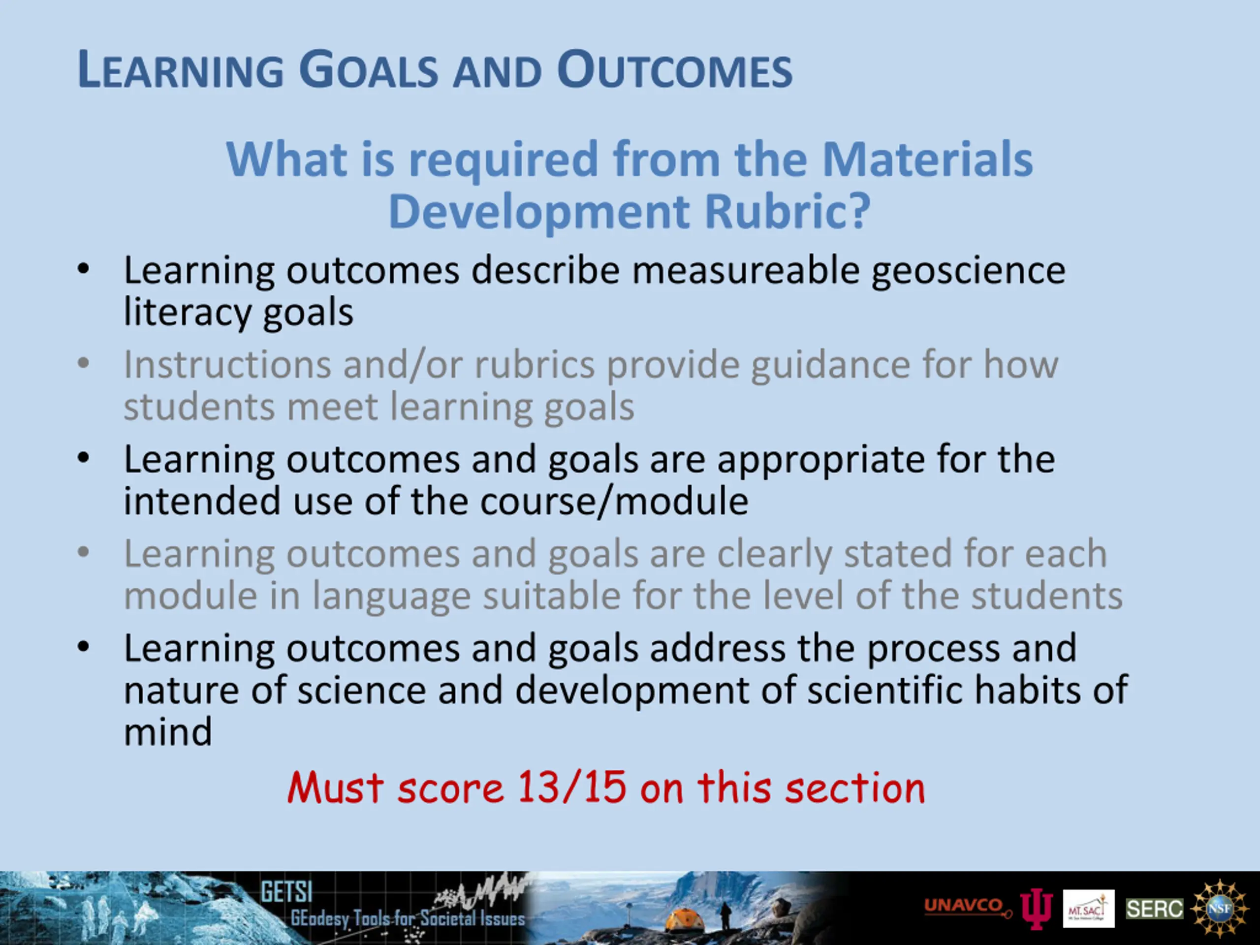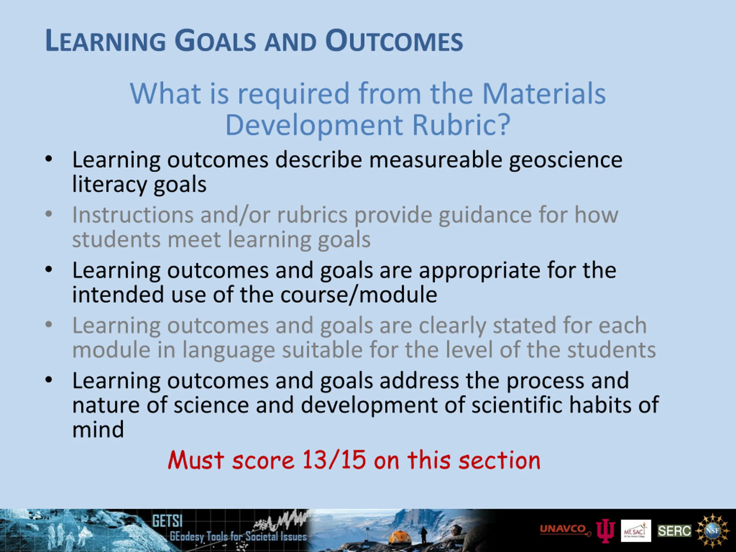 LEARNING GOALSAND OUTCOMES What is required from the Materials Development Rubric? Learning outcomes describe measureable geoscience literacy goals Instructions and/or rubrics provide guidance for how students meet learning goals Learning outcomes and goals are appropriate for the intended use of the course/module Learning outcomes and goals are clearly stated for each module in language suitable for the level of the students Learning outcomes and goals address the process and nature of science and development of scientific habits of mind Must score 13/15 on this section