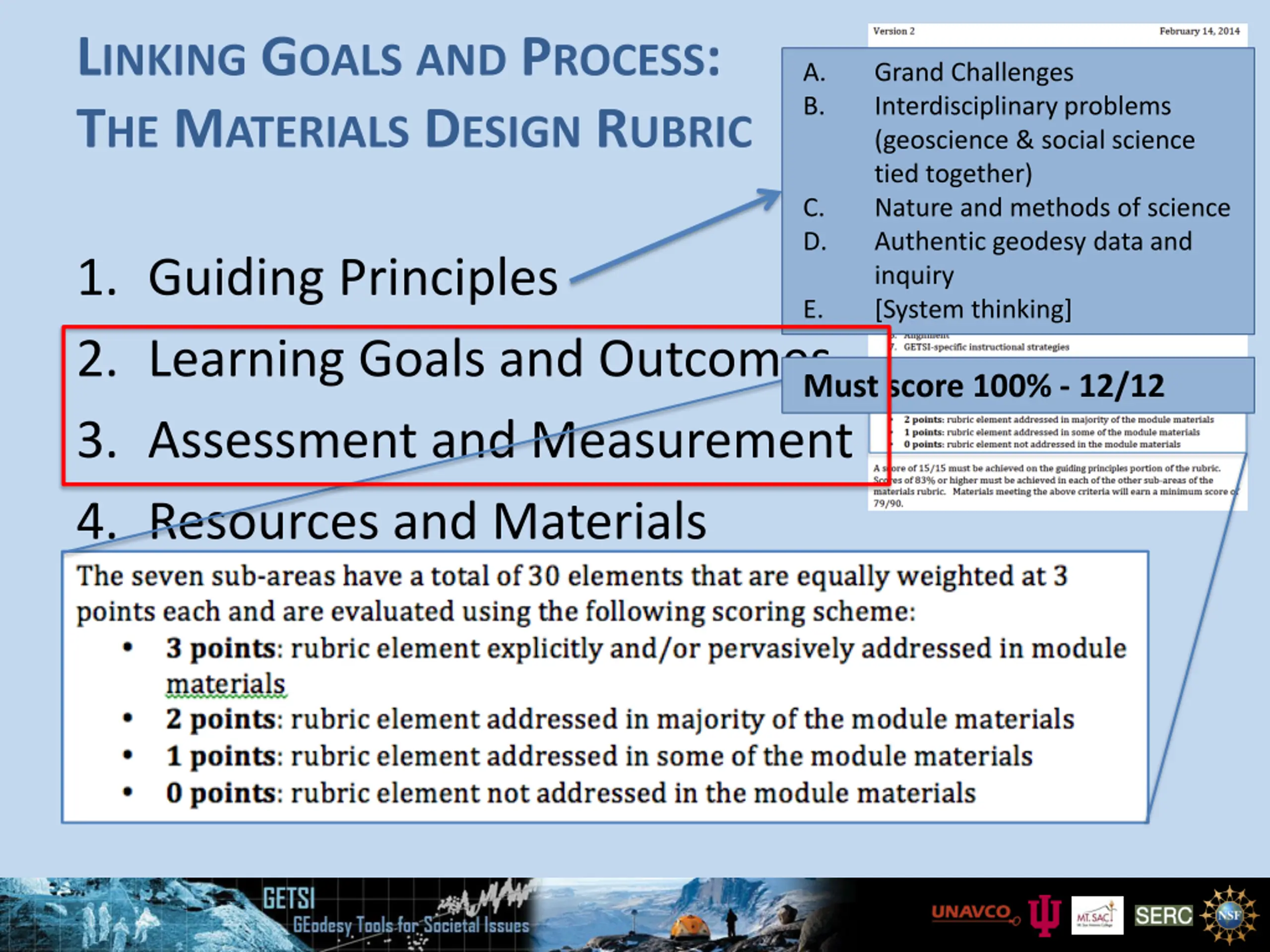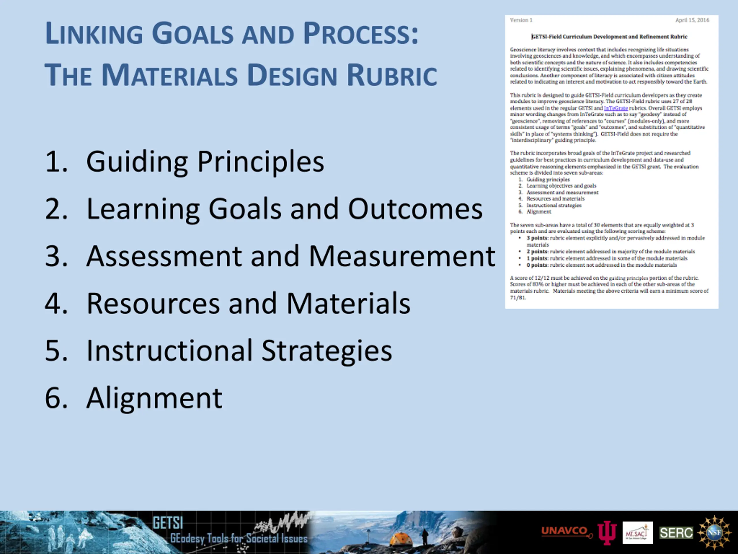 LINKING GOALSAND PROCESS: THE MATERIALS DESIGN RUBRIC 1. Guiding Principles 2. Learning Goals and Outcomes 3. Assessment and Measurement 4. Resources and Materials 5. Instructional Strategies 6. Alignment