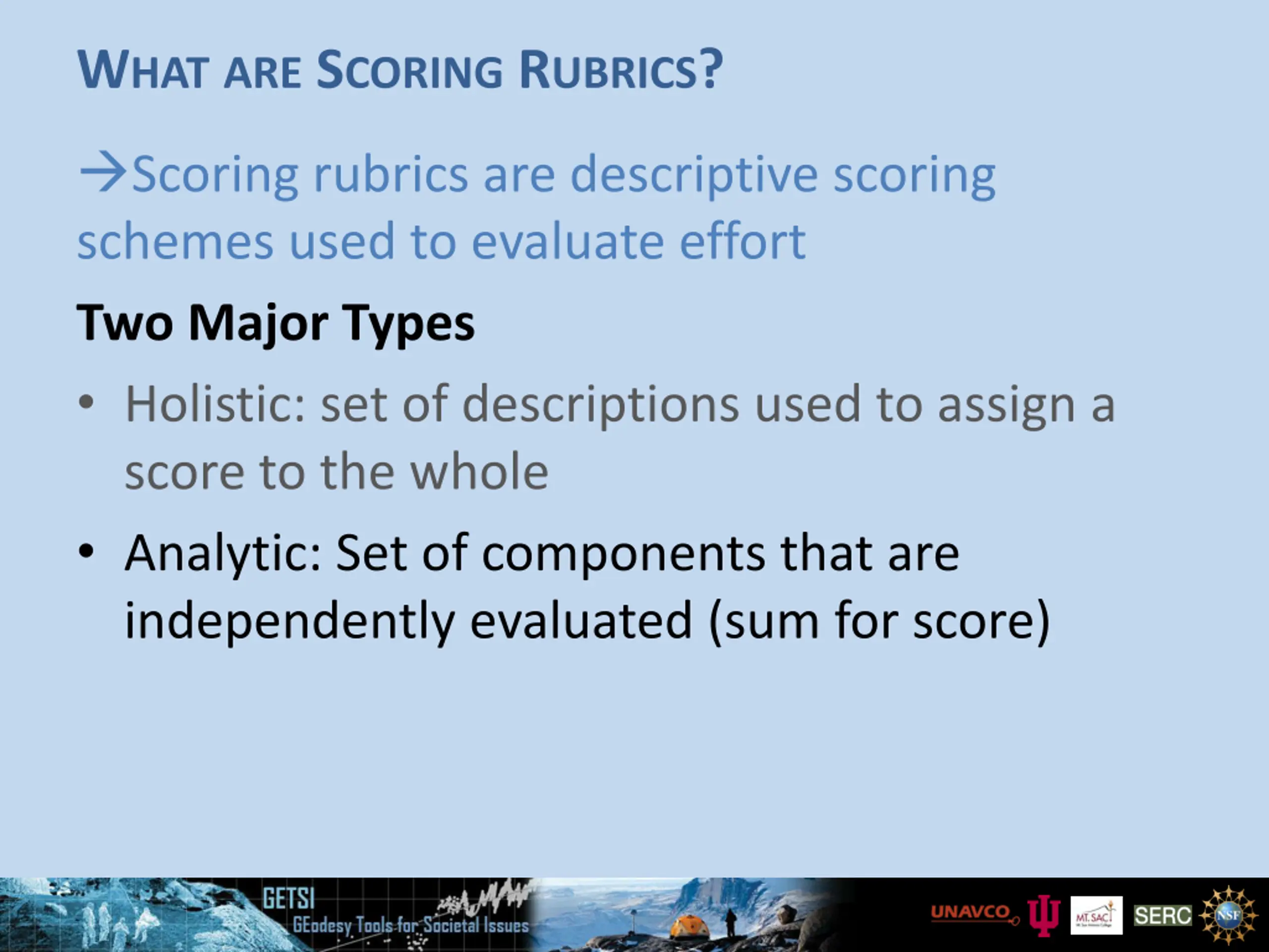 WHATARE SCORING RUBRICS? Scoring rubrics are descriptive scoring schemes used to evaluate effort Two Major Types Holistic: set of descriptions used to assign a score to the whole Analytic: Set of components that are independently evaluated (sum for score)