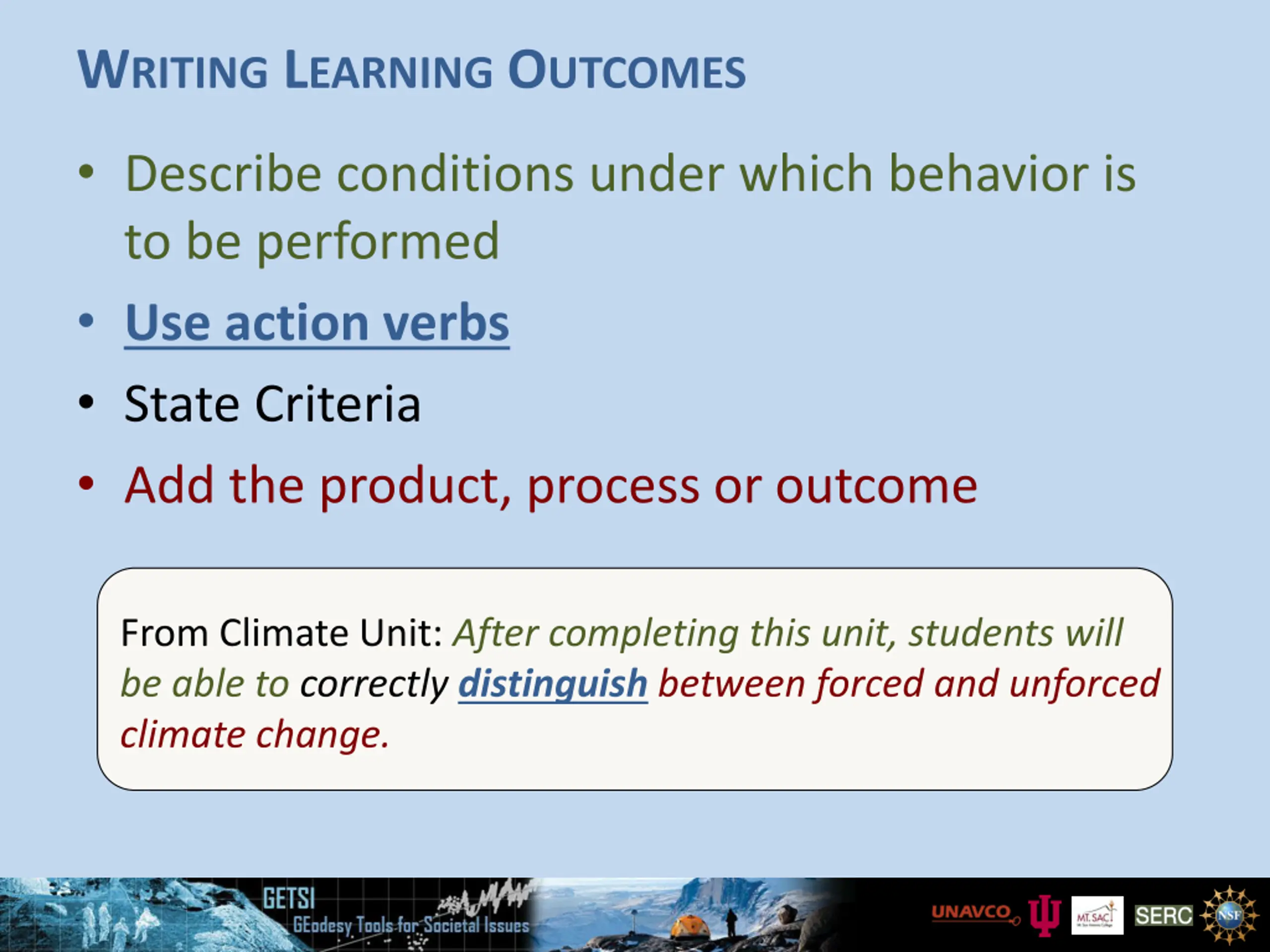 WRITING LEARNING OUTCOMES Describe conditions under which behavior is to be performed Use action verbs State Criteria Add the product, process or outcome From Climate Unit: After completing this unit, students will be able to correctly distinguish between forced and unforced climate change.