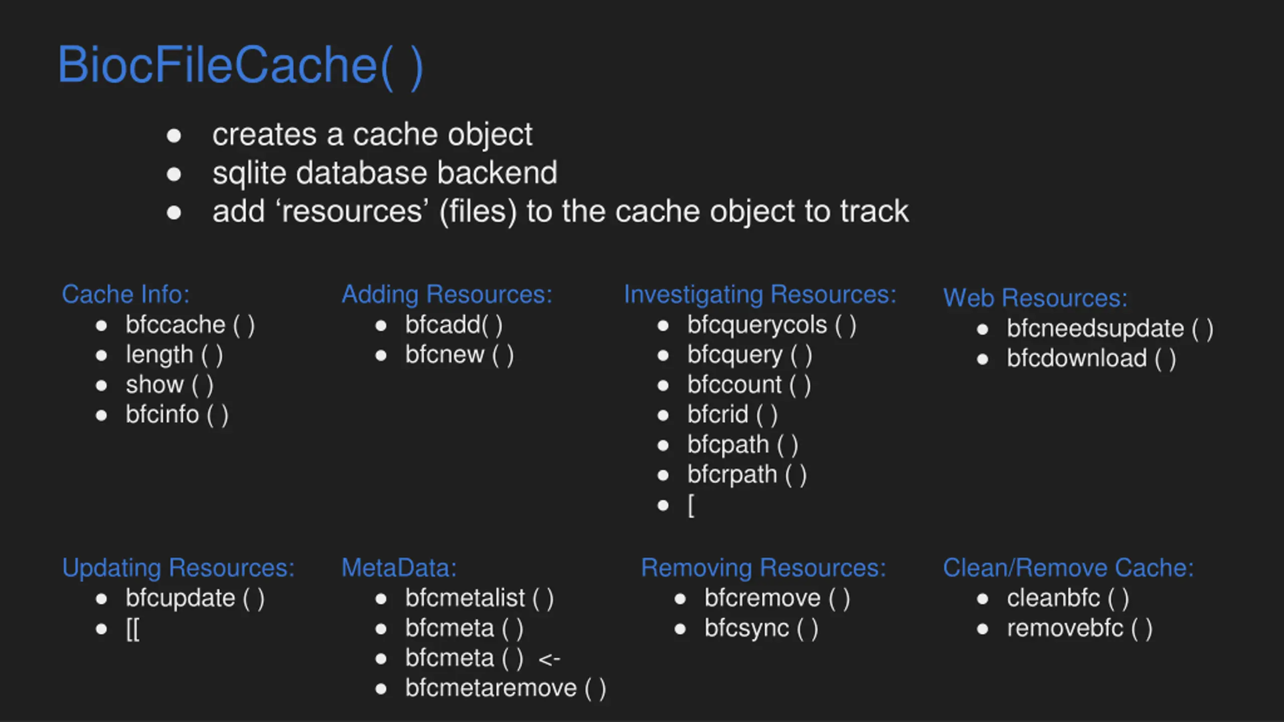 BiocFileCache( ) creates a cache object sqlite database backend add resources (files) to the cache object to track Cache Info: bfccache ( ) length ( ) show ( ) bfcinfo ( ) Adding Resources: bfcadd( ) bfcnew ( ) Investigating Resources: bfcquerycols ( ) bfcquery ( ) bfccount ( ) bfcrid ( ) bfcpath ( ) bfcrpath ( ) [ Web Resources: bfcneedsupdate ( ) bfcdownload ( ) Updating Resources: bfcupdate ( ) [[ MetaData: bfcmetalist ( ) bfcmeta ( ) bfcmeta ( ) <- bfcmetaremove ( ) Removing Resources: bfcremove ( ) bfcsync ( ) Clean/Remove Cache: cleanbfc ( ) removebfc ( )
