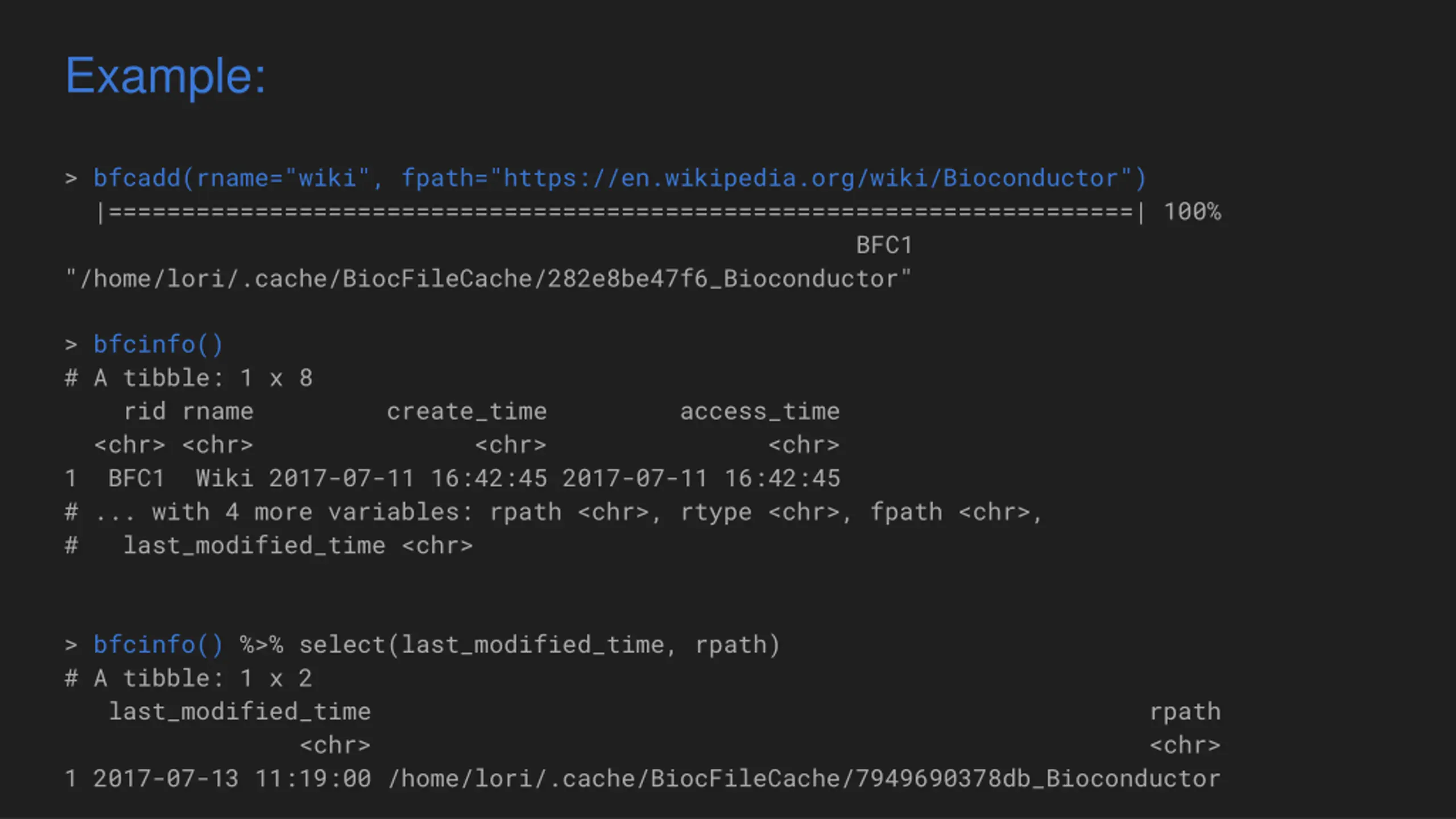 Example: > bfcadd(rname="wiki", fpath="https://en.wikipedia.org/wiki/Bioconductor") |======================================================================| 100% BFC1 "/home/lori/.cache/BiocFileCache/282e8be47f6_Bioconductor" > bfcinfo() # A tibble: 1 x 8 rid rname create_time access_time <chr> <chr> <chr> <chr> 1 BFC1 Wiki 2017-07-11 16:42:45 2017-07-11 16:42:45 # ... with 4 more variables: rpath <chr>, rtype <chr>, fpath <chr>, # last_modified_time <chr> > bfcinfo() %>% select(last_modified_time, rpath) # A tibble: 1 x 2 last_modified_time rpath <chr> <chr> 1 2017-07-13 11:19:00 /home/lori/.cache/BiocFileCache/7949690378db_Bioconductor