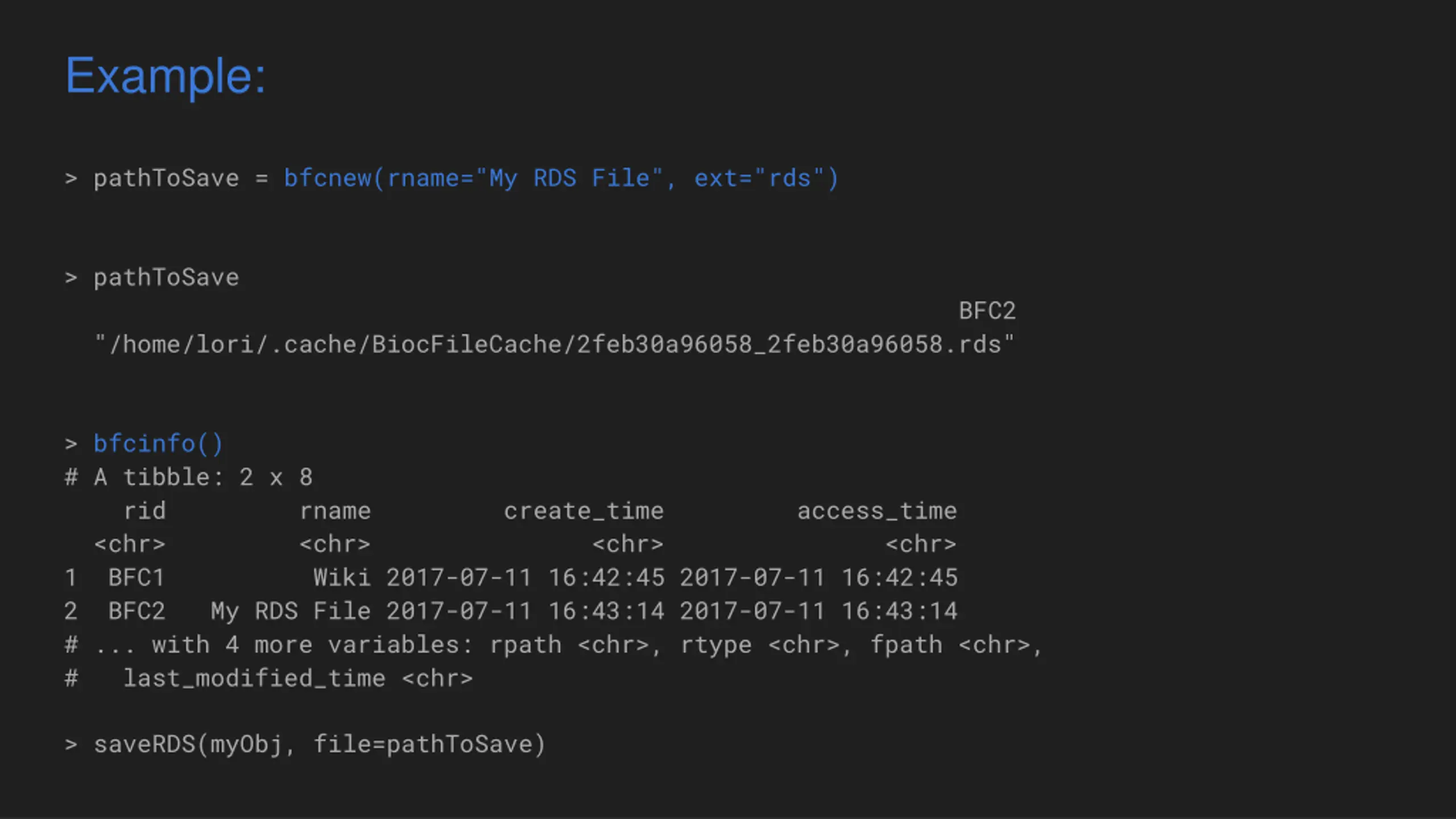 Example: > pathToSave = bfcnew(rname="My RDS File", ext="rds") > pathToSave BFC2 "/home/lori/.cache/BiocFileCache/2feb30a96058_2feb30a96058.rds" > bfcinfo() # A tibble: 2 x 8 rid rname create_time access_time <chr> <chr> <chr> <chr> 1 BFC1 Wiki 2017-07-11 16:42:45 2017-07-11 16:42:45 2 BFC2 My RDS File 2017-07-11 16:43:14 2017-07-11 16:43:14 # ... with 4 more variables: rpath <chr>, rtype <chr>, fpath <chr>, # last_modified_time <chr> > saveRDS(myObj, file=pathToSave)