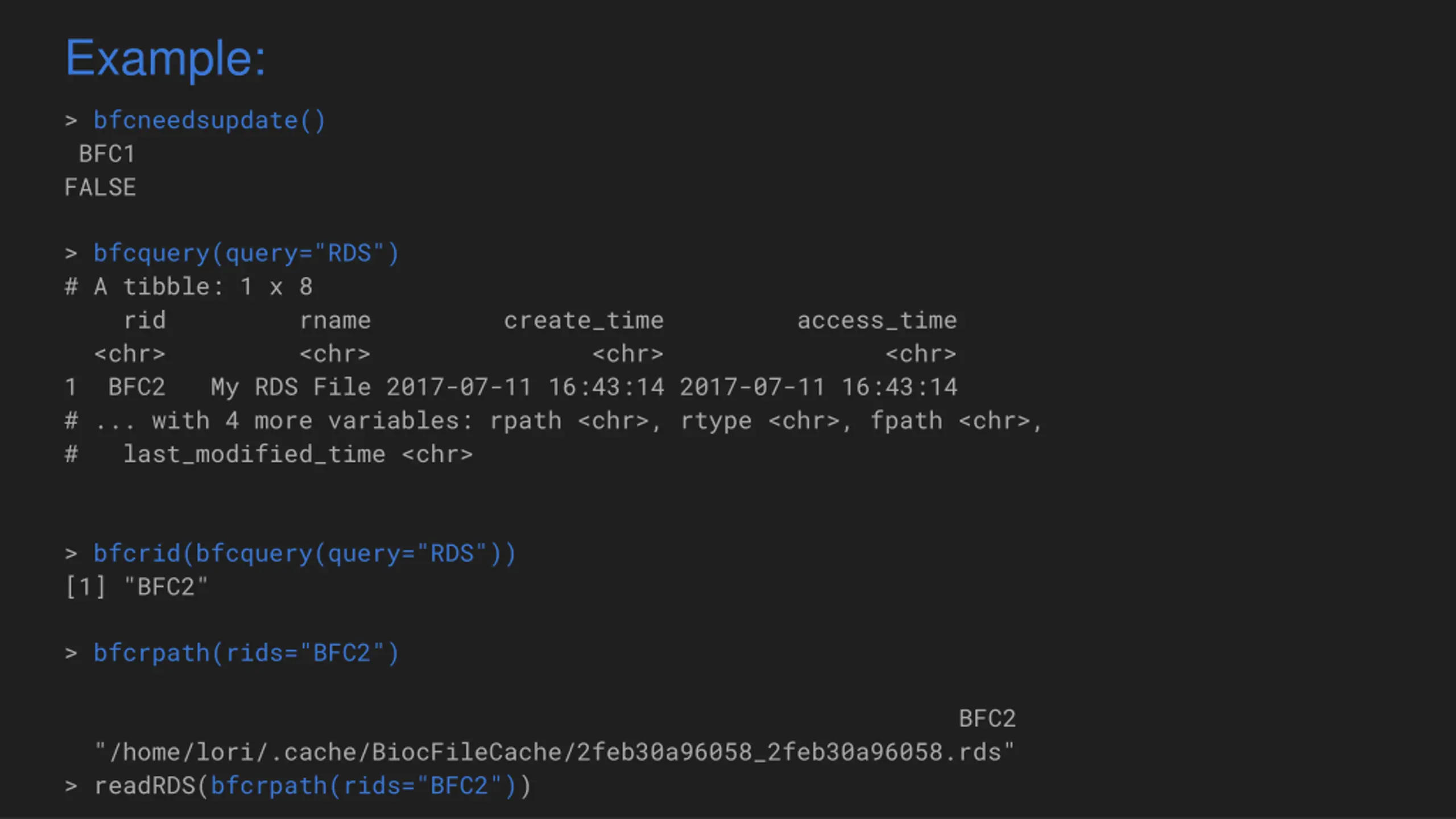Example: > bfcneedsupdate() BFC1 FALSE > bfcquery(query="RDS") # A tibble: 1 x 8 rid rname create_time access_time <chr> <chr> <chr> <chr> 1 BFC2 My RDS File 2017-07-11 16:43:14 2017-07-11 16:43:14 # ... with 4 more variables: rpath <chr>, rtype <chr>, fpath <chr>, # last_modified_time <chr> > bfcrid(bfcquery(query="RDS")) [1] "BFC2" > bfcrpath(rids="BFC2") BFC2 "/home/lori/.cache/BiocFileCache/2feb30a96058_2feb30a96058.rds" > readRDS(bfcrpath(rids="BFC2"))