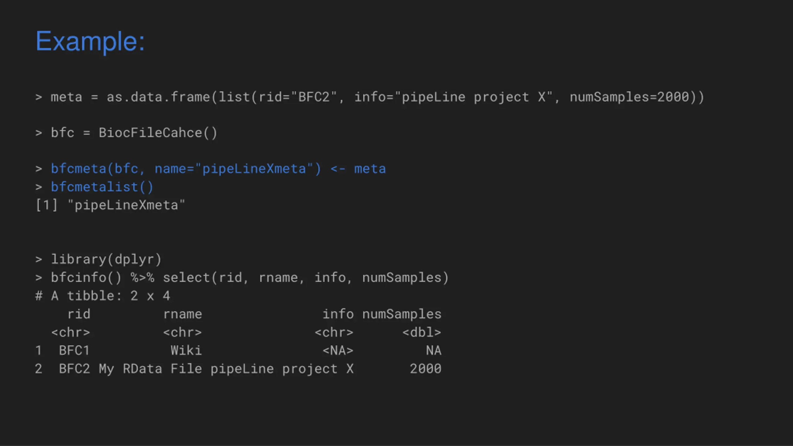 Example: > meta = as.data.frame(list(rid="BFC2", info="pipeLine project X", numSamples=2000)) > bfc = BiocFileCahce() > bfcmeta(bfc, name="pipeLineXmeta") <- meta > bfcmetalist() [1] "pipeLineXmeta" > library(dplyr) > bfcinfo() %>% select(rid, rname, info, numSamples) # A tibble: 2 x 4 rid rname info numSamples <chr> <chr> <chr> <dbl> 1 BFC1 Wiki <NA> NA 2 BFC2 My RData File pipeLine project X 2000