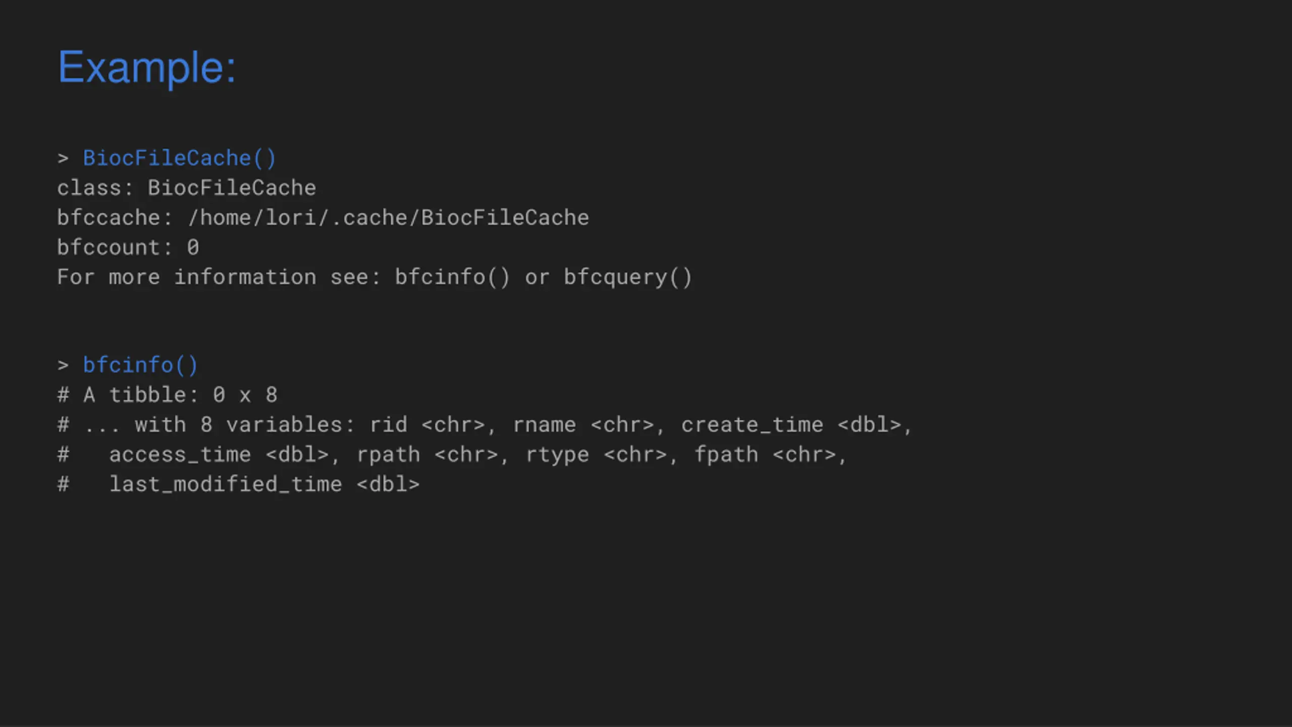 Example: > BiocFileCache() class: BiocFileCache bfccache: /home/lori/.cache/BiocFileCache bfccount: 0 For more information see: bfcinfo() or bfcquery() > bfcinfo() # A tibble: 0 x 8 # ... with 8 variables: rid <chr>, rname <chr>, create_time <dbl>, # access_time <dbl>, rpath <chr>, rtype <chr>, fpath <chr>, # last_modified_time <dbl>